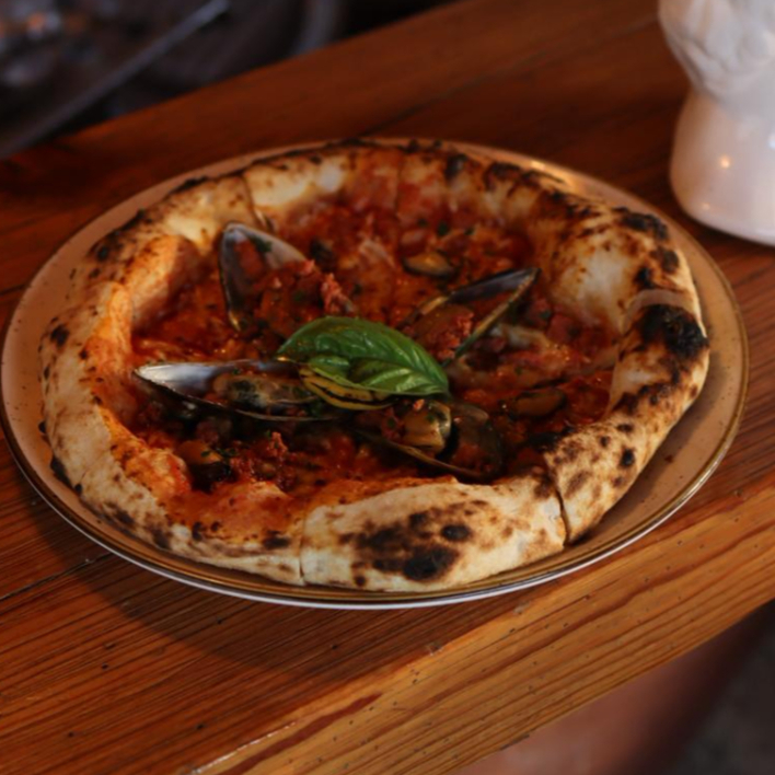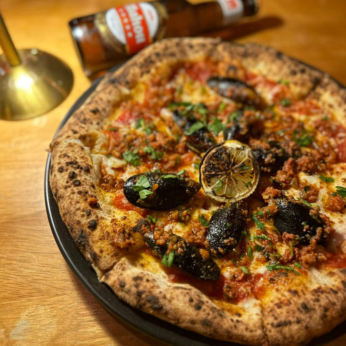 Pomodoro, mozzarella, mejillones, chorizo español y perejil.