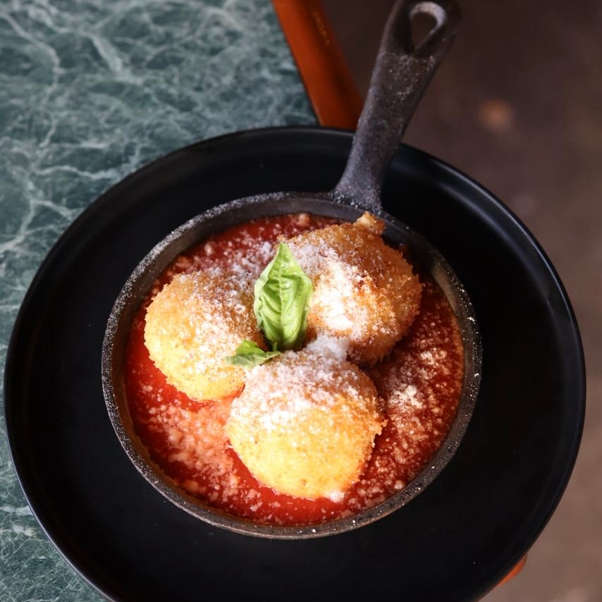 Bolitas de mozzarella empanizadas y fritas, servidas con salsa pomodoro.
