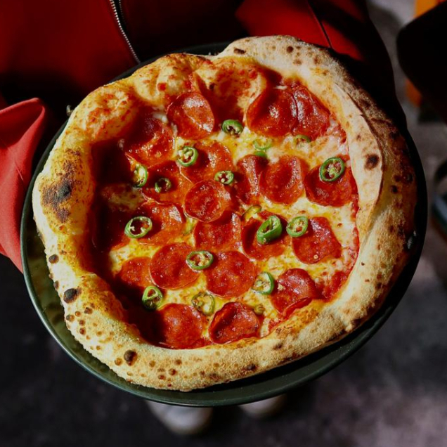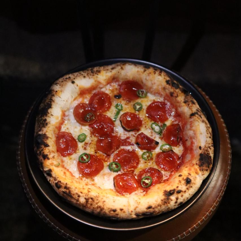 Pomodoro, pepperoni, mozzarella, rodajas de chile serrano y miel de habanero.