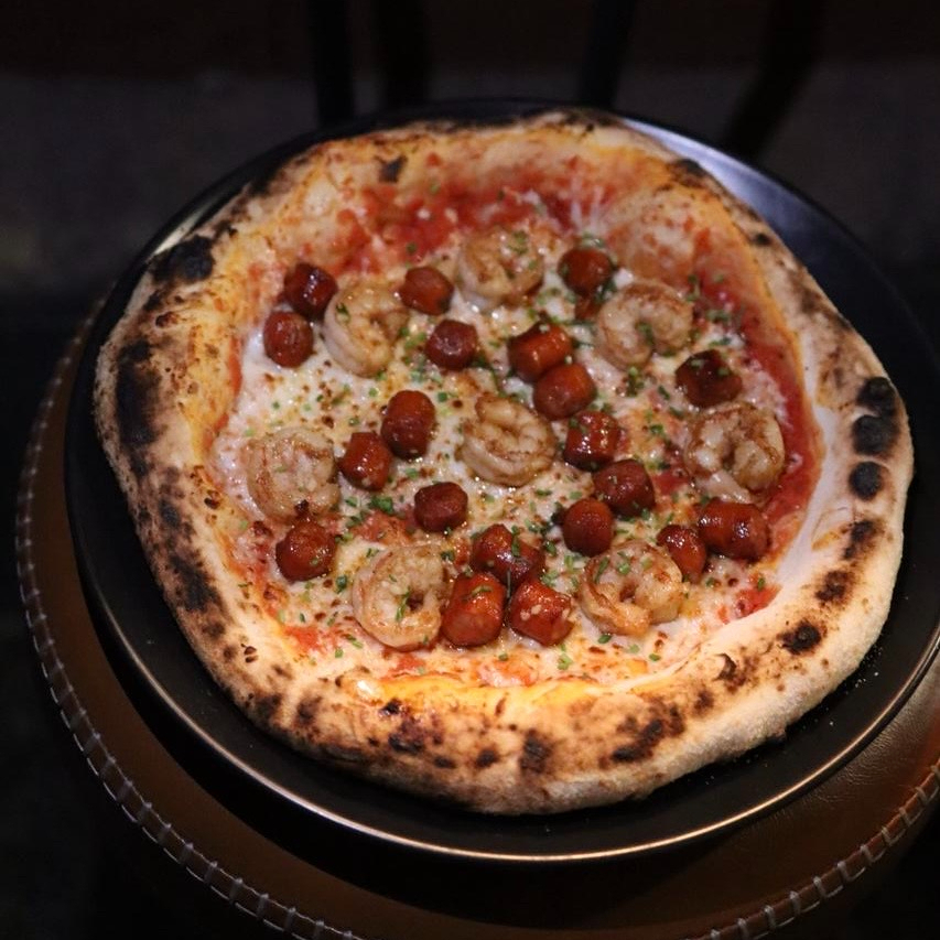 Pomodoro con camarones, mozzarella, chistorra y ajo.