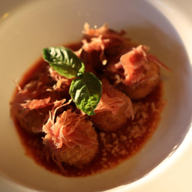 Croquetas crujientes de prosciutto con parmesano, acompañadas de salsa de tomate.