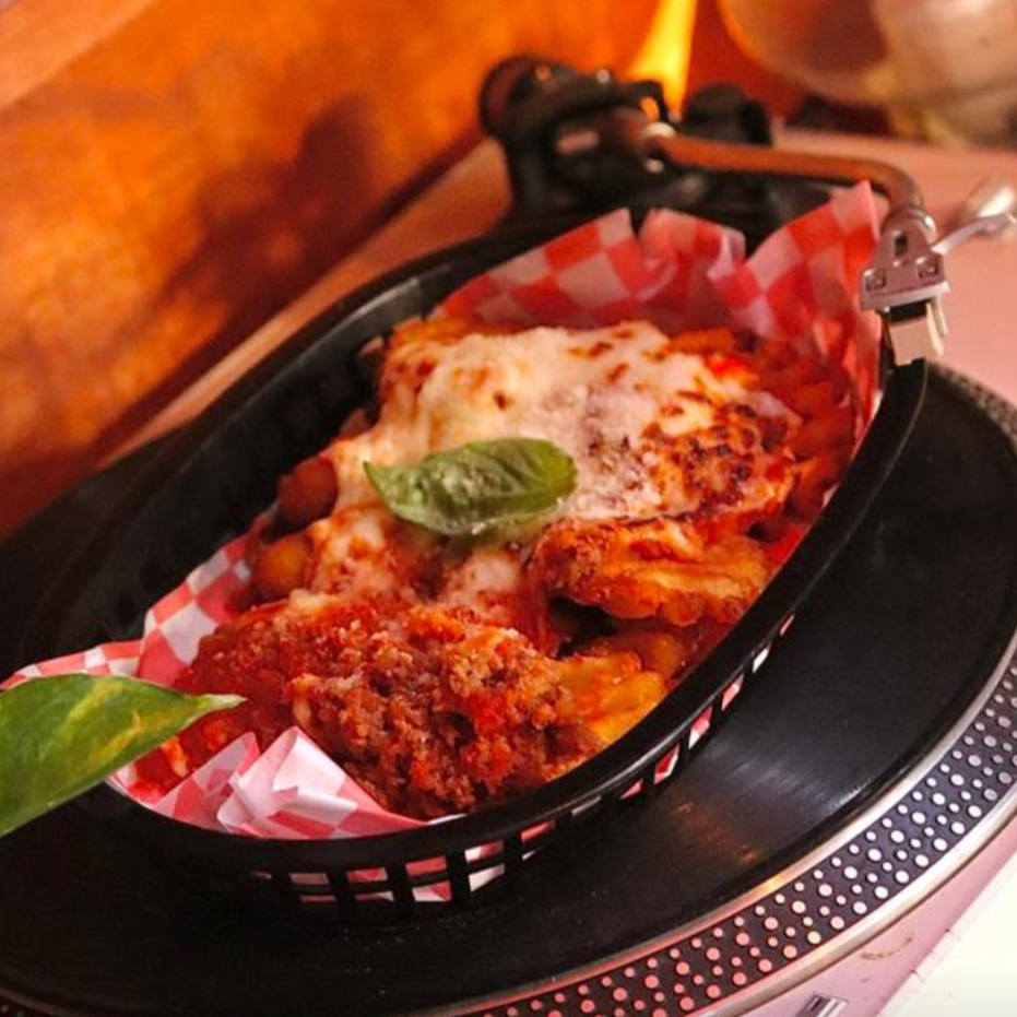 Papas a la francesa cubiertas con ragú boloñesa, mozzarella y parmesano.