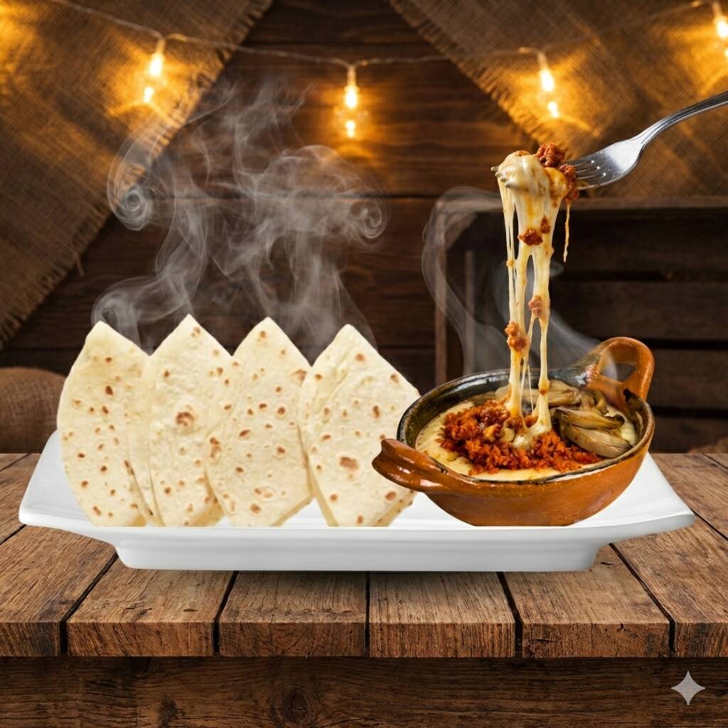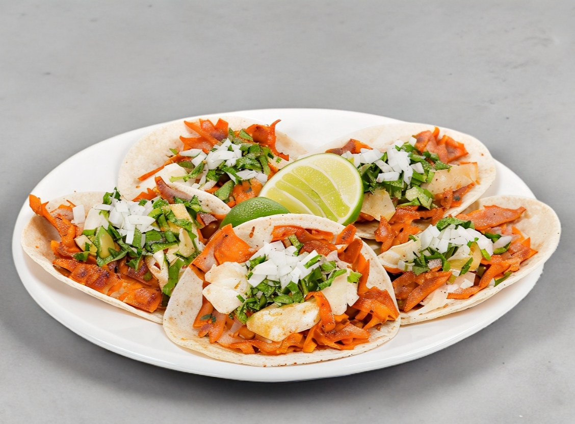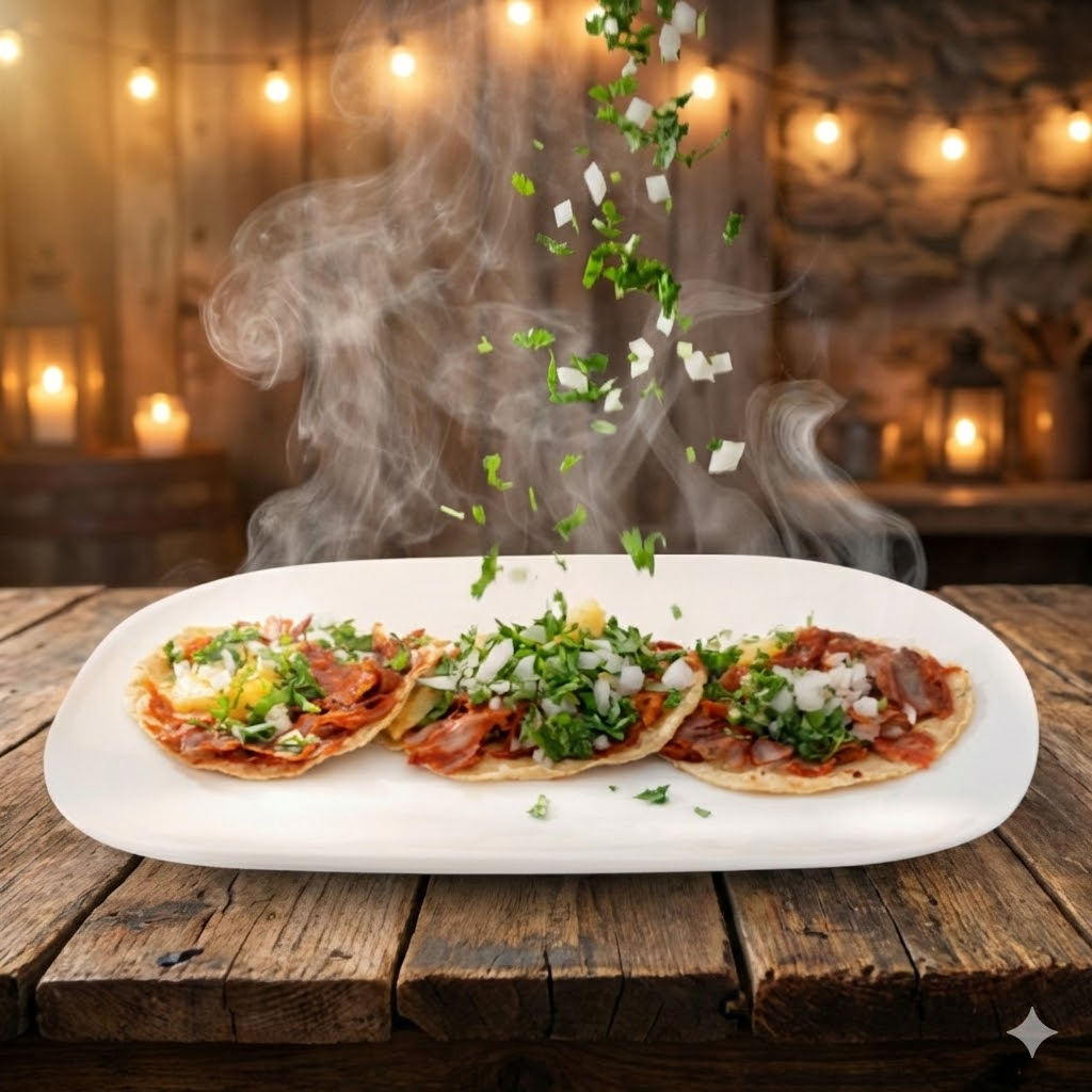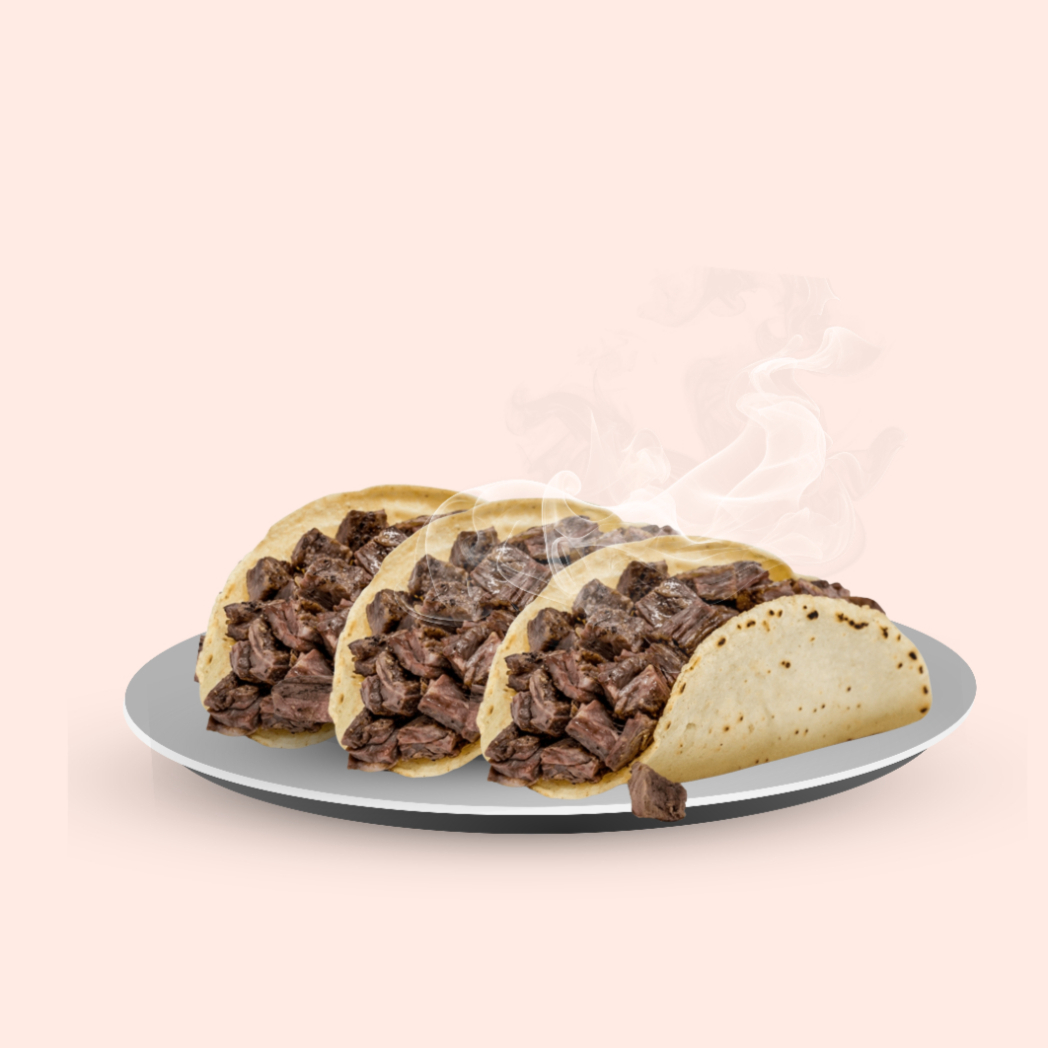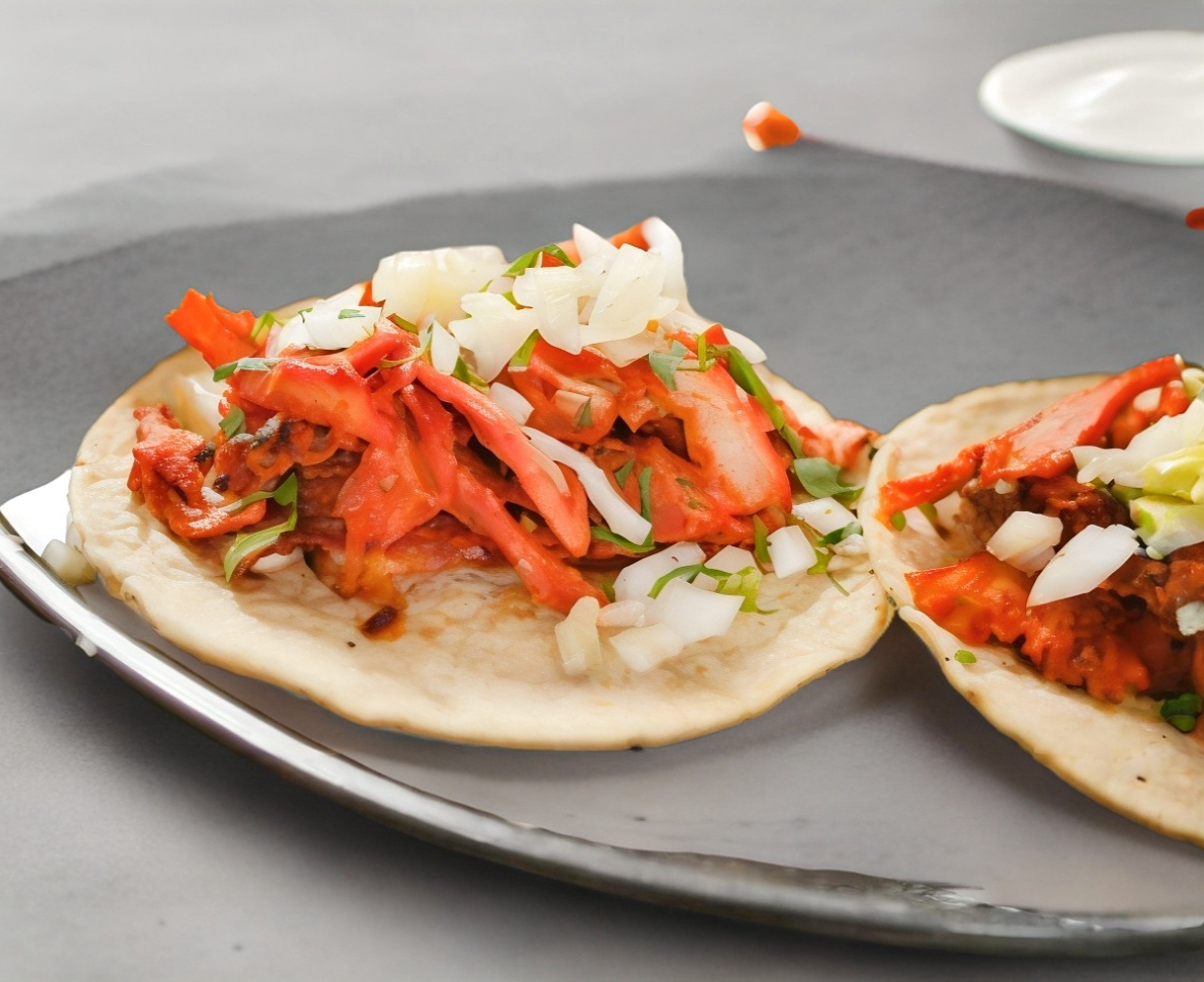 Pastor, cilantro, piña, cebolla y queso acompañado de tortilla de maíz.