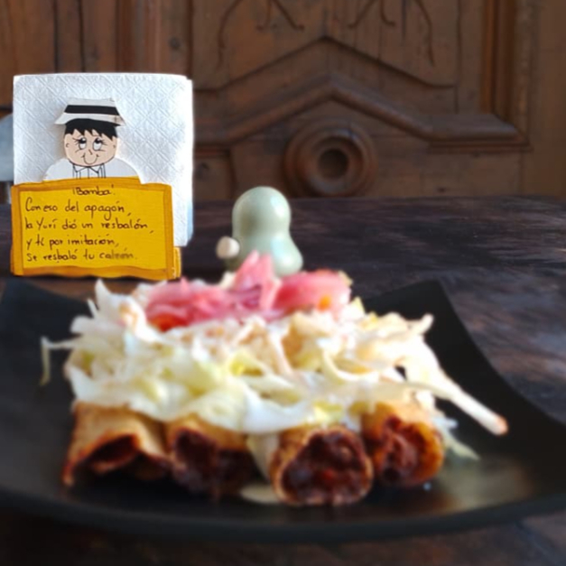 Tacos dorados rellenos de cochinita, preparados con crema, lechuga queso y cebolla morada con habanero