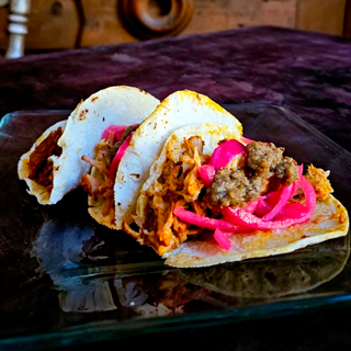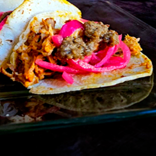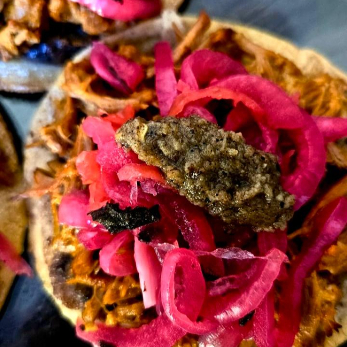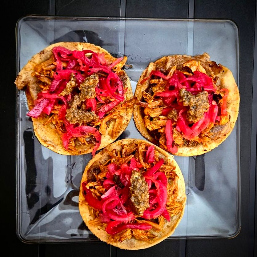 Tortilla dorada rellena de frijoles, coronada con Cochinita Pibil