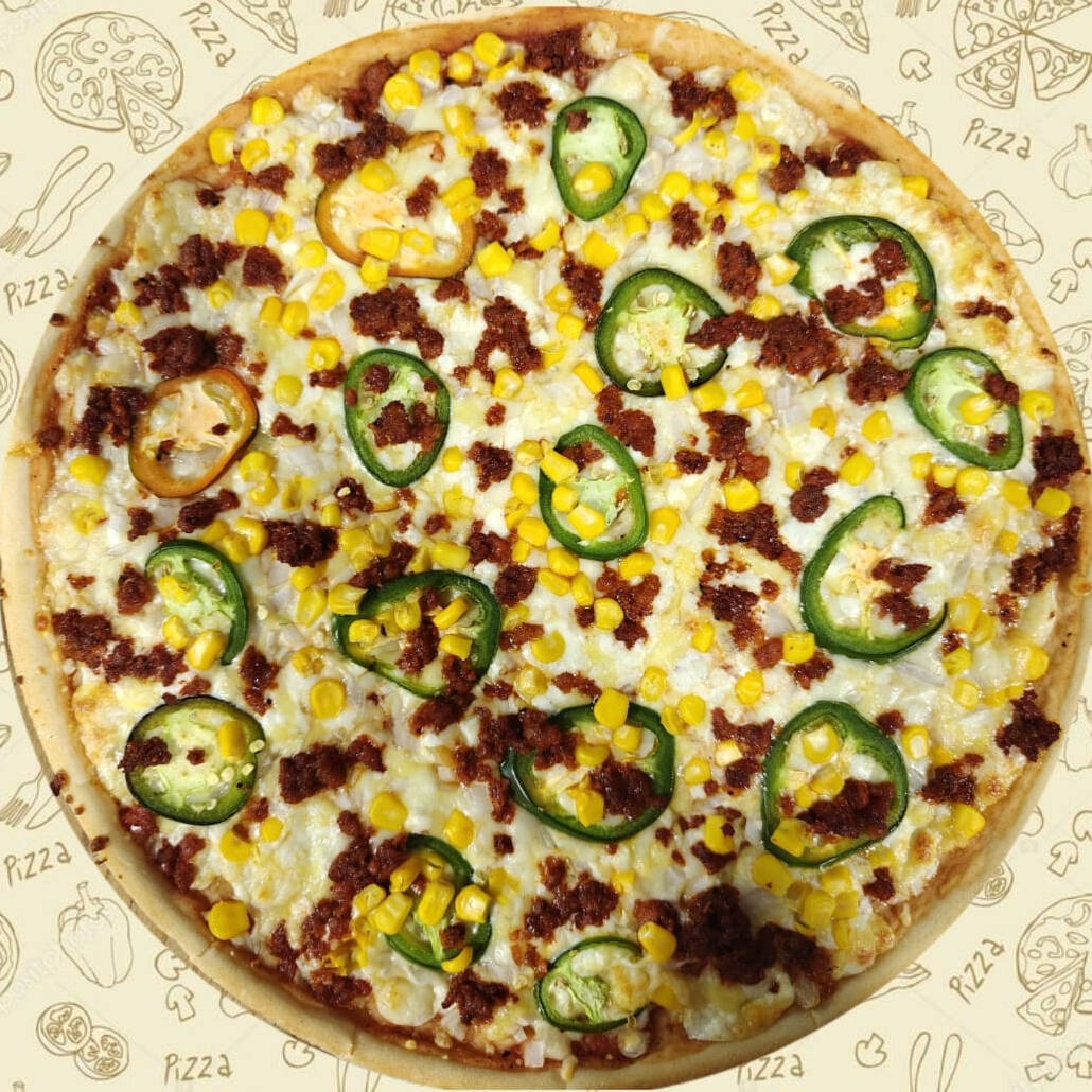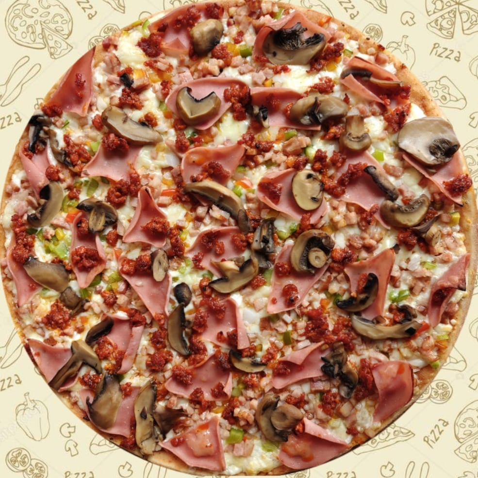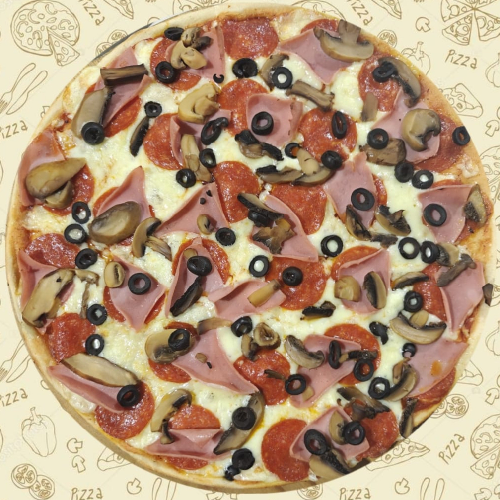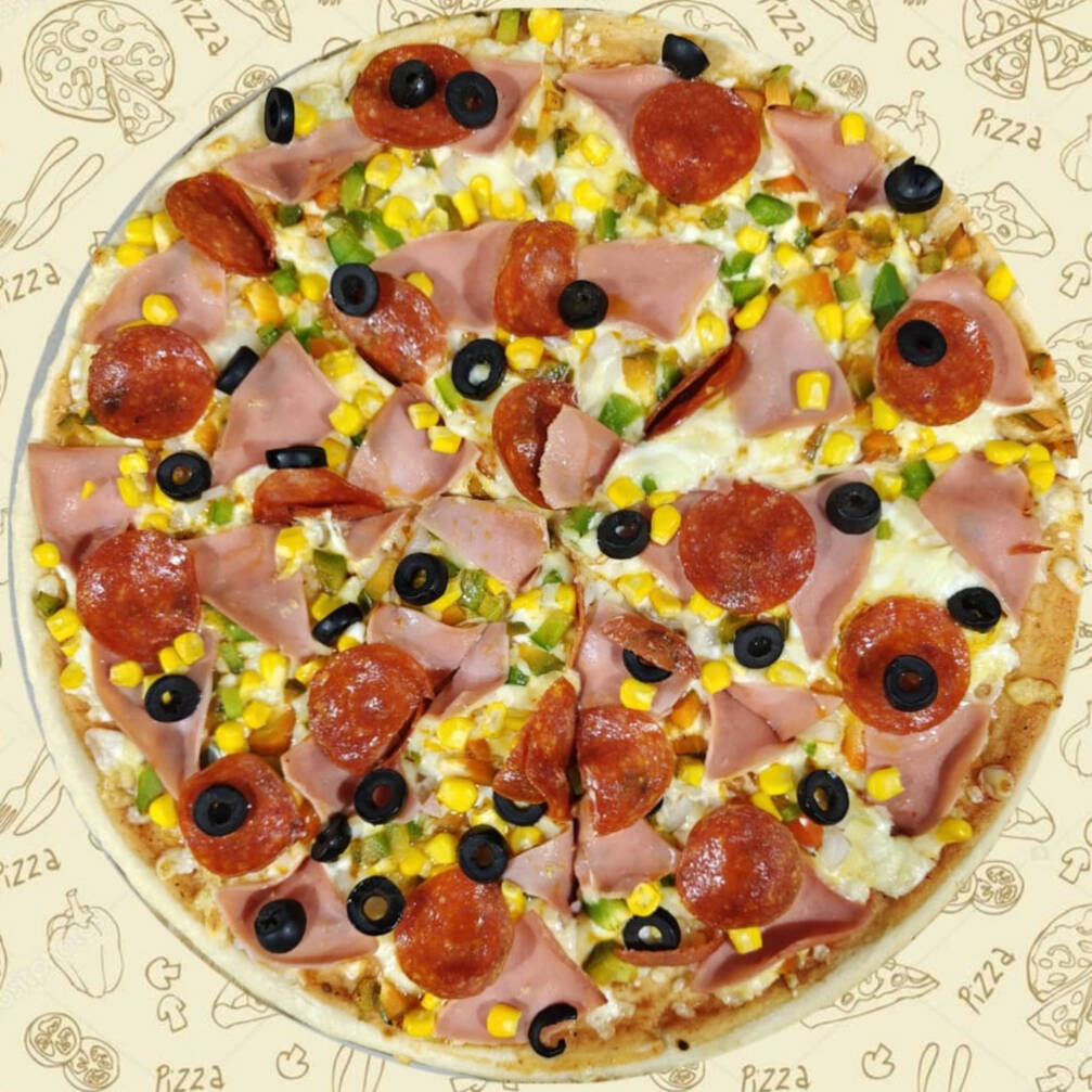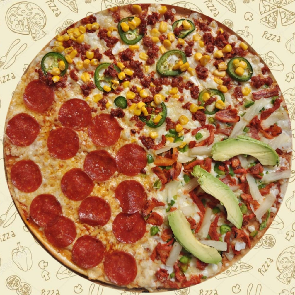 MASA DE 350g. PURE, QUESO, PEPPERONI, TOCINO, CEBOLLA, MORRON, ELOTE Y ACEITUNA NEGRA.