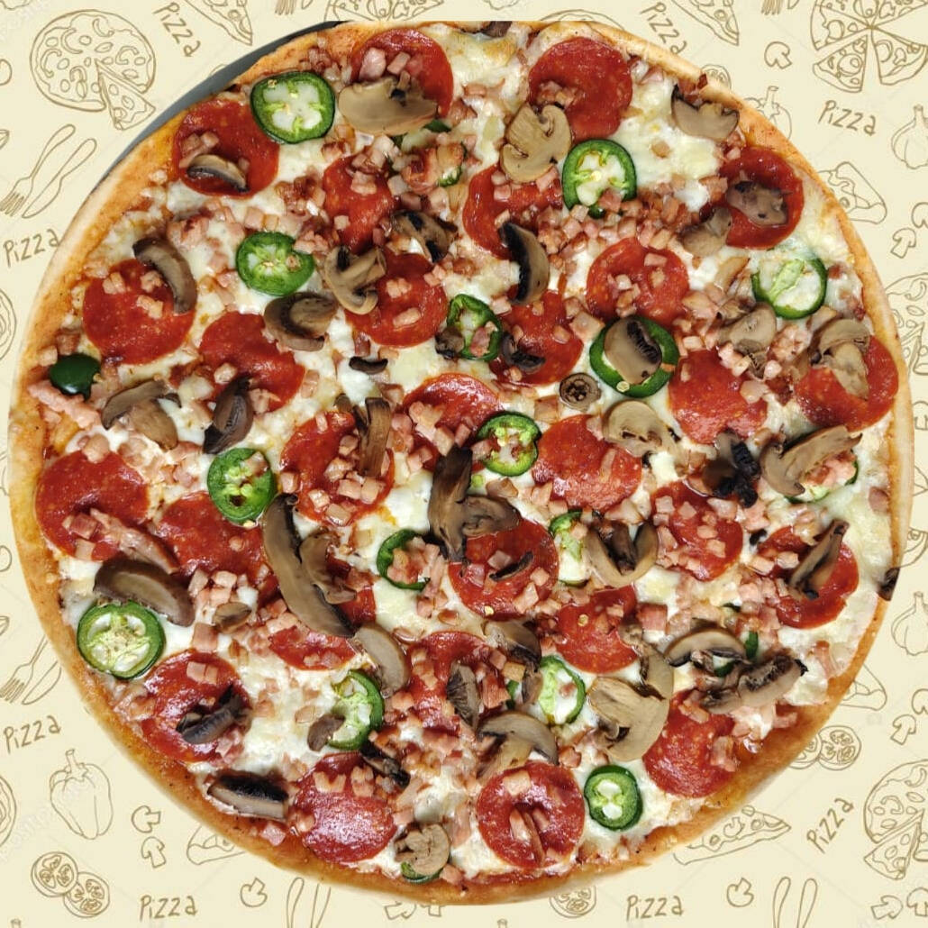 MASA DE 350g. PURE, QUESO, PEPPERONI, TOCINO, CHAMPIÑON Y CHILE JALAPEÑO.