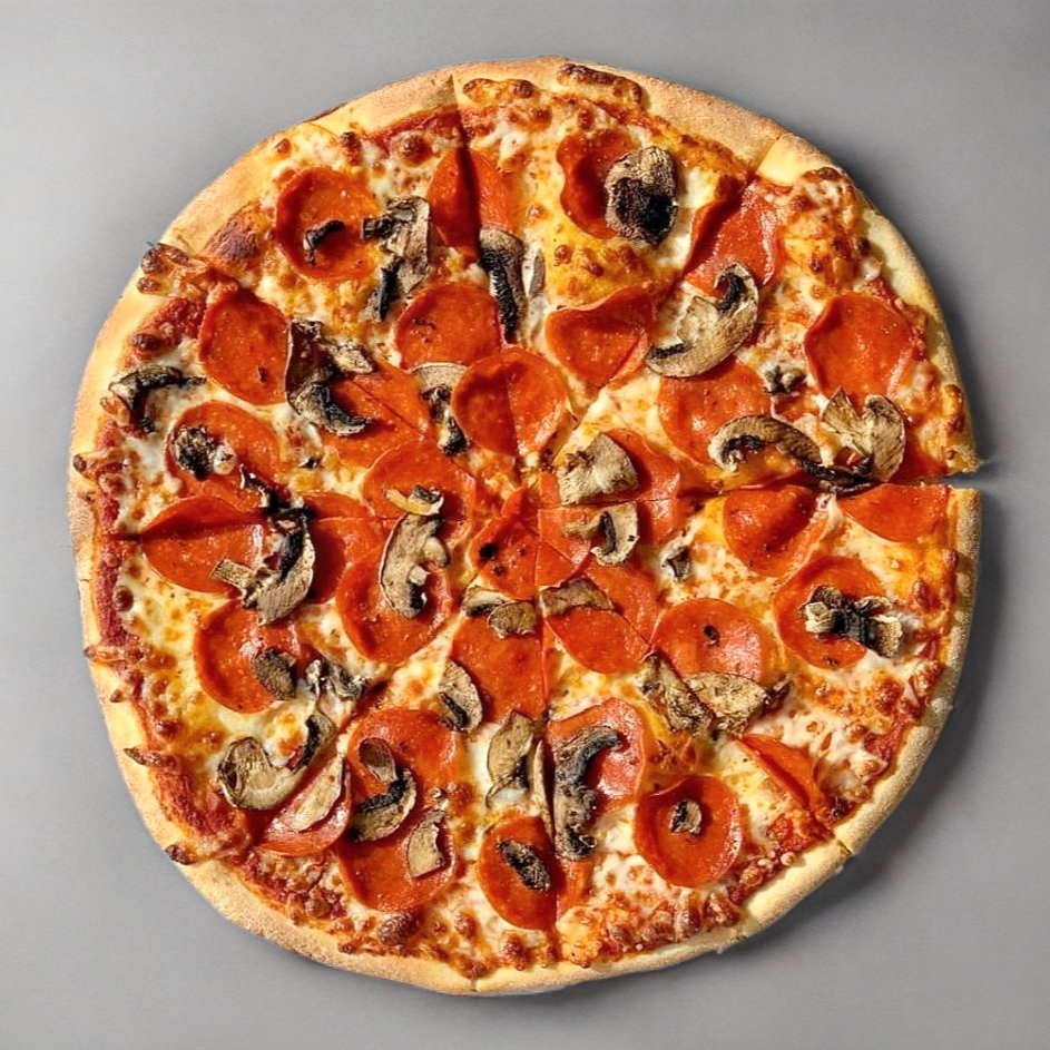 Pizza grande de 8 rebanadas con pepperoni, cebolla, jamón, tocino, aceitunas, chorizo, orégano y mozzarella.
