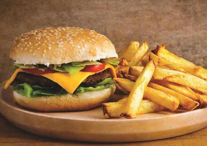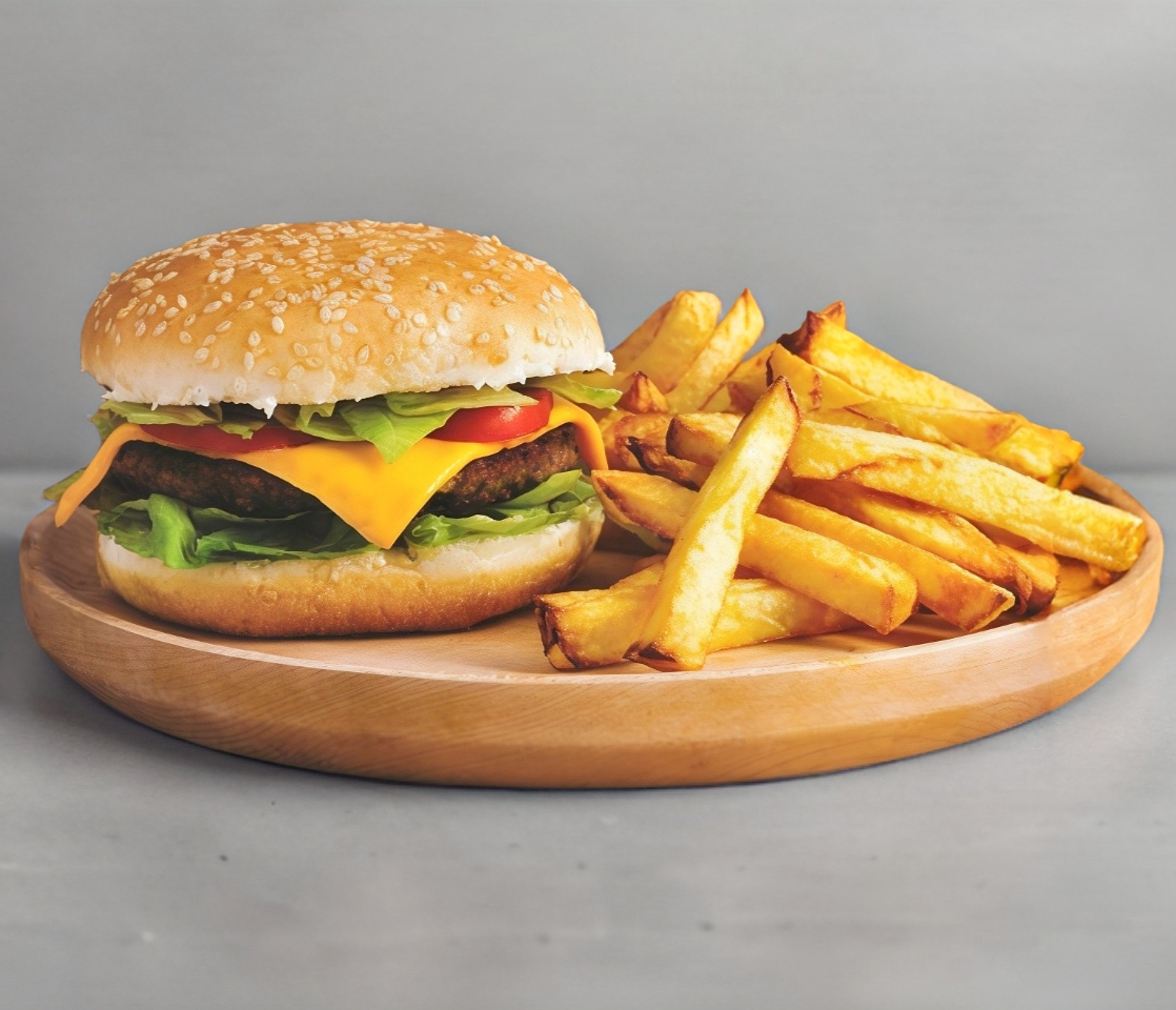 Hamburguesa de res con queso, lechuga, tomate, cebolla, pepinillo, cátsup, mostaza y mayonesa.
