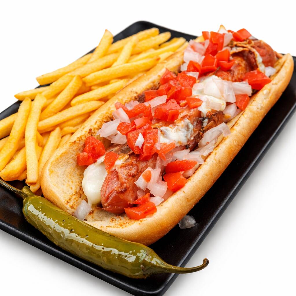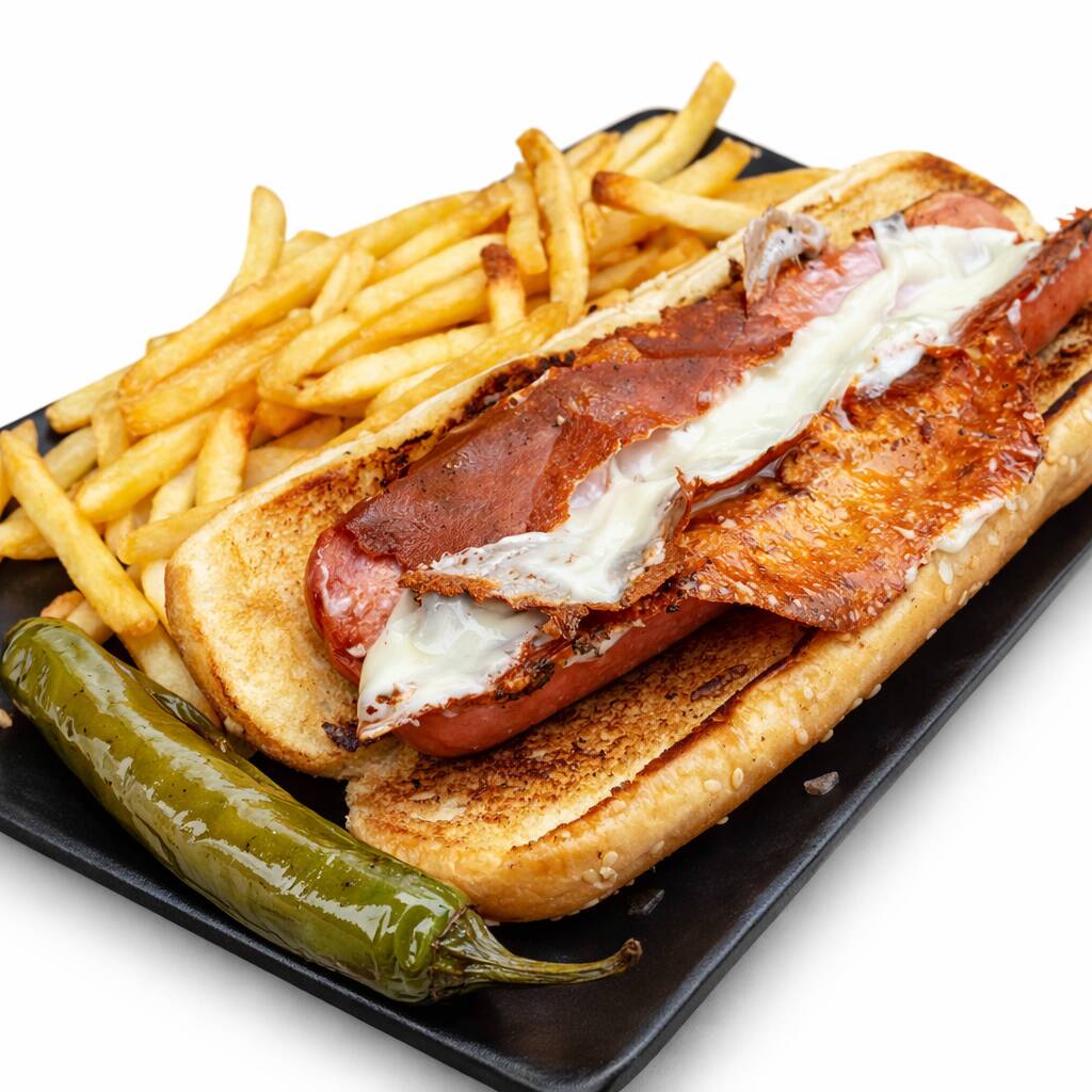 Disfruta de nuestro delicioso Hot Dog jumbo, hecho con pan, salchicha, queso de pizza, tocino jitomate, cebolla, chile toreado acompañado con una porción de papas a la francesa.
