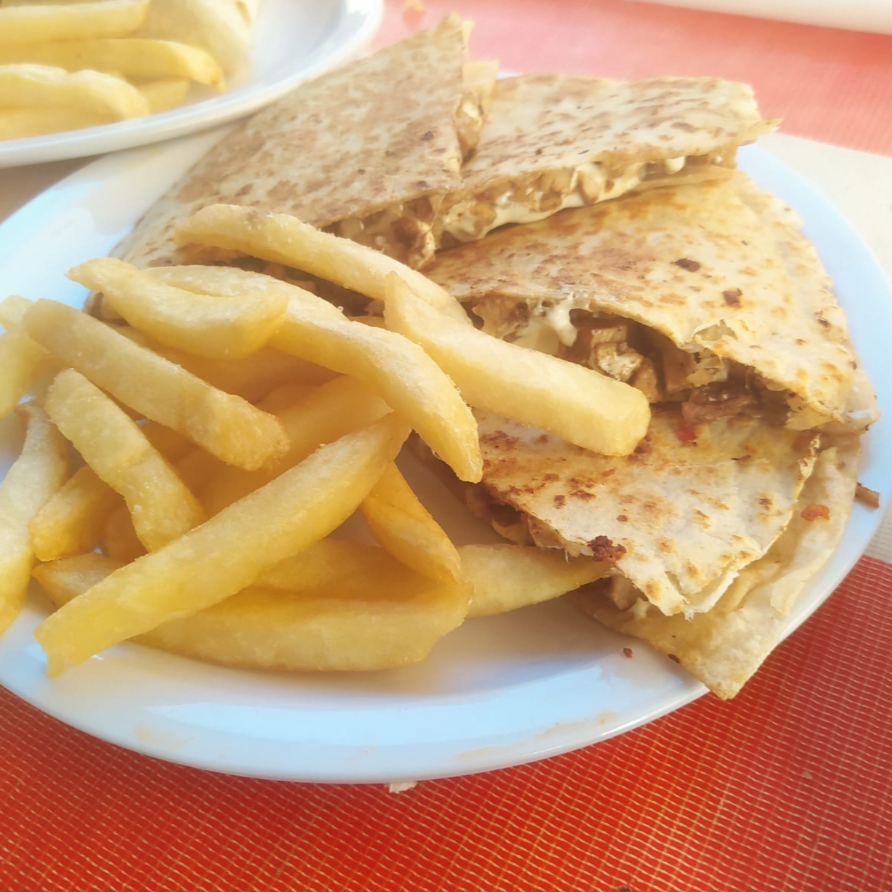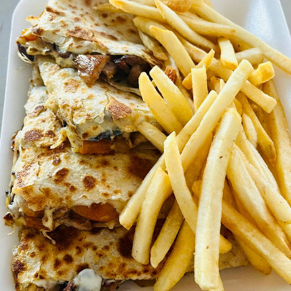 Disfruta de nuestra deliciosa sincronizada hecha con dos tortillas burreras cortadas en cuartos, bistec, morrón, cebolla, queso de pizza acompañada con una porción de papas a la francesa
