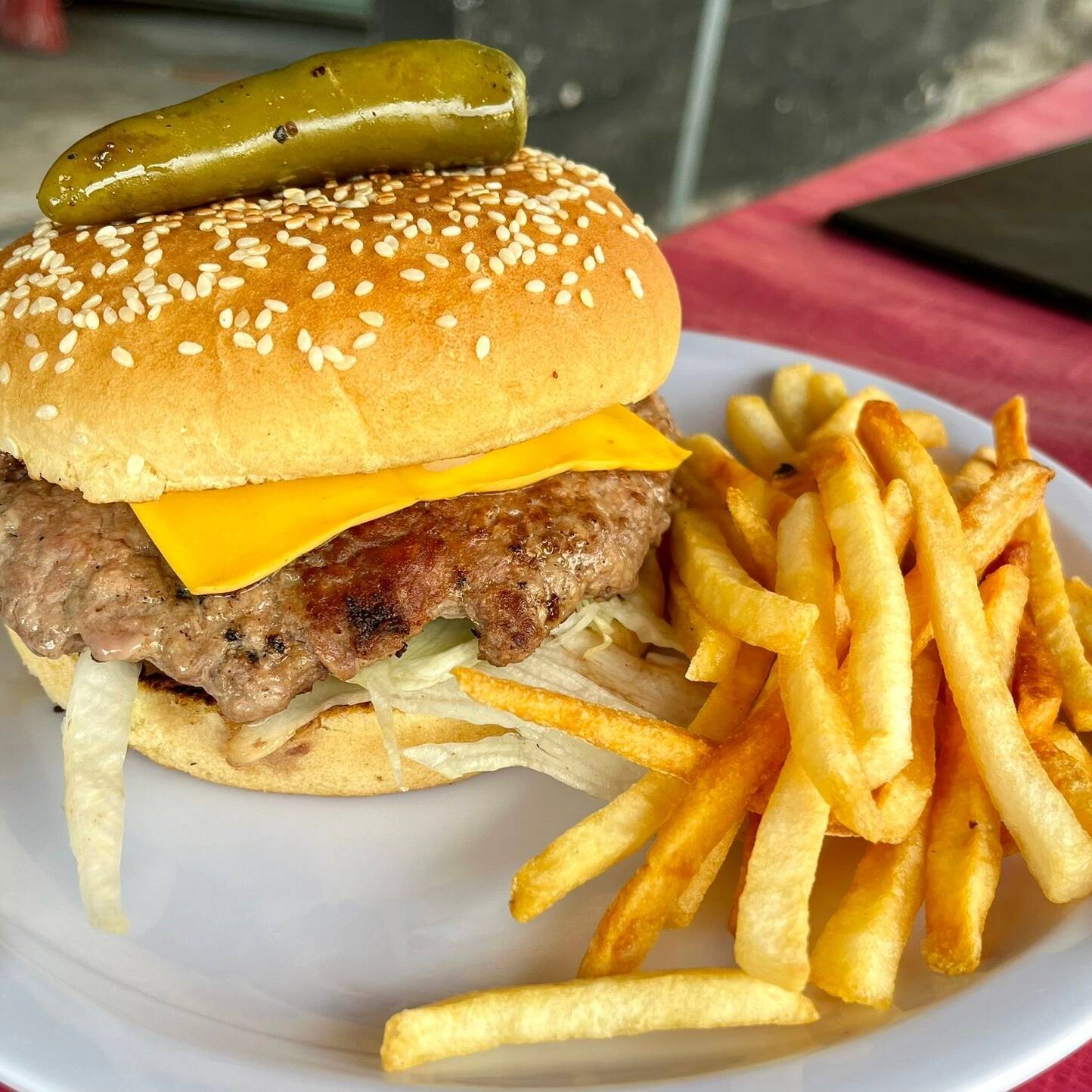 Pan de hamburguesa, mayonesa, carne receta original, queso amarrillo, lechuga, jitomate, cebolla, porción de papas chile toreado