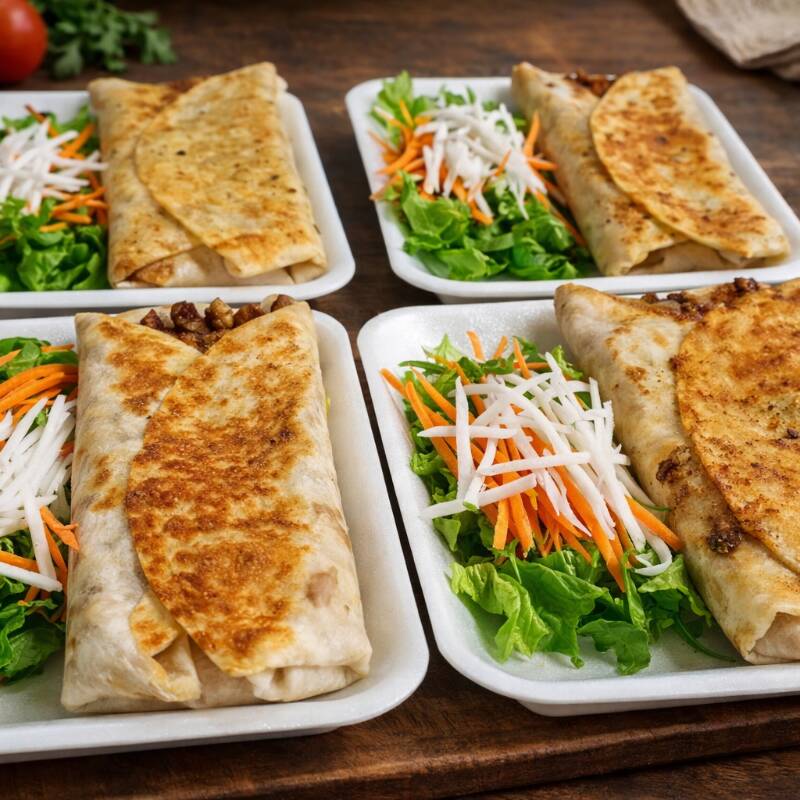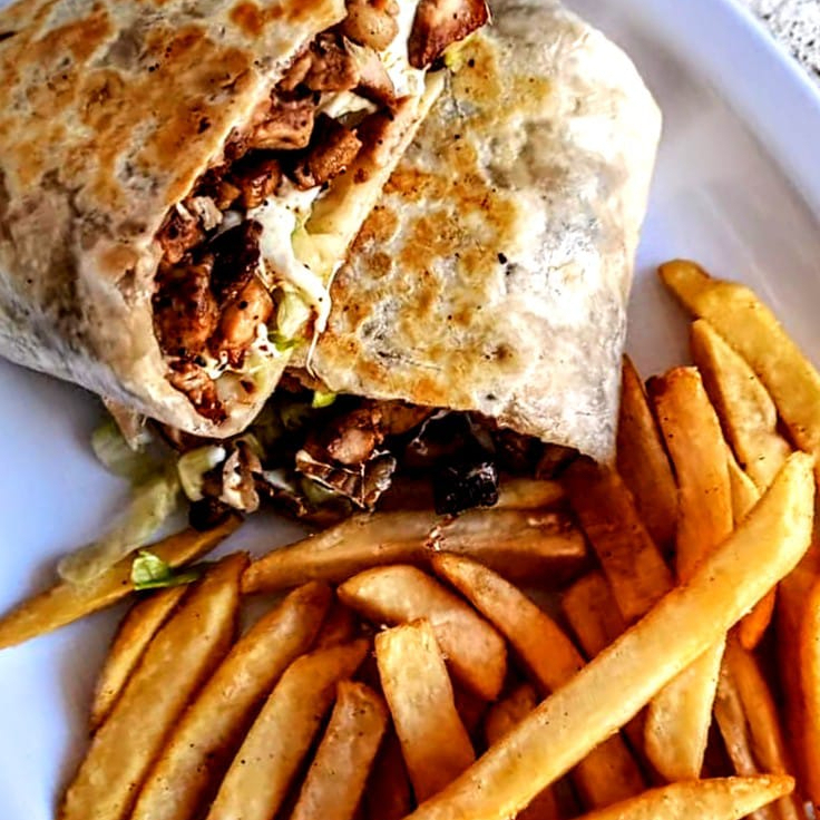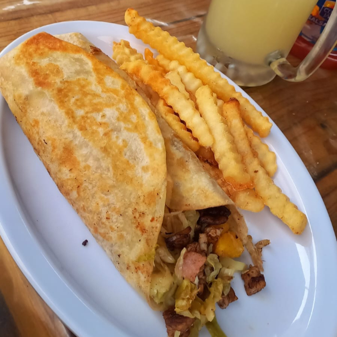 Tortilla burrera, frijoles refritos, bistec, morrón, cebolla, queso de pizza, lechuga, va acompañado con una porción de papas a la francesa
