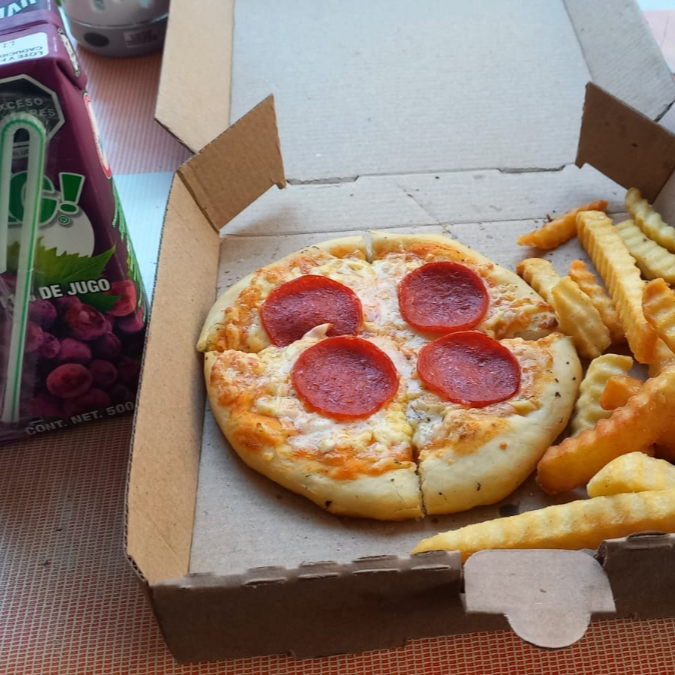 Disfruta de nuestra deliciosa mini pizza, escoge entre pepperoni o hawaiana, acompañada con una porción de papas y un juguito