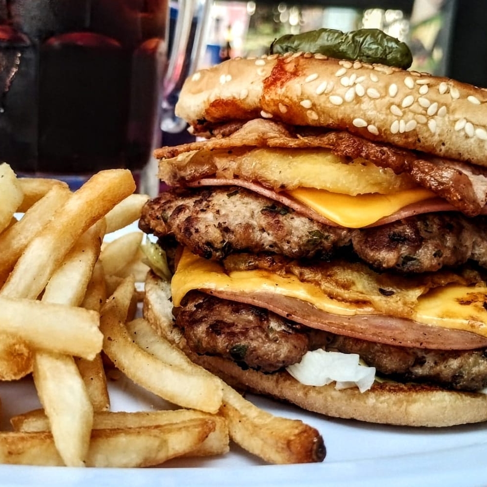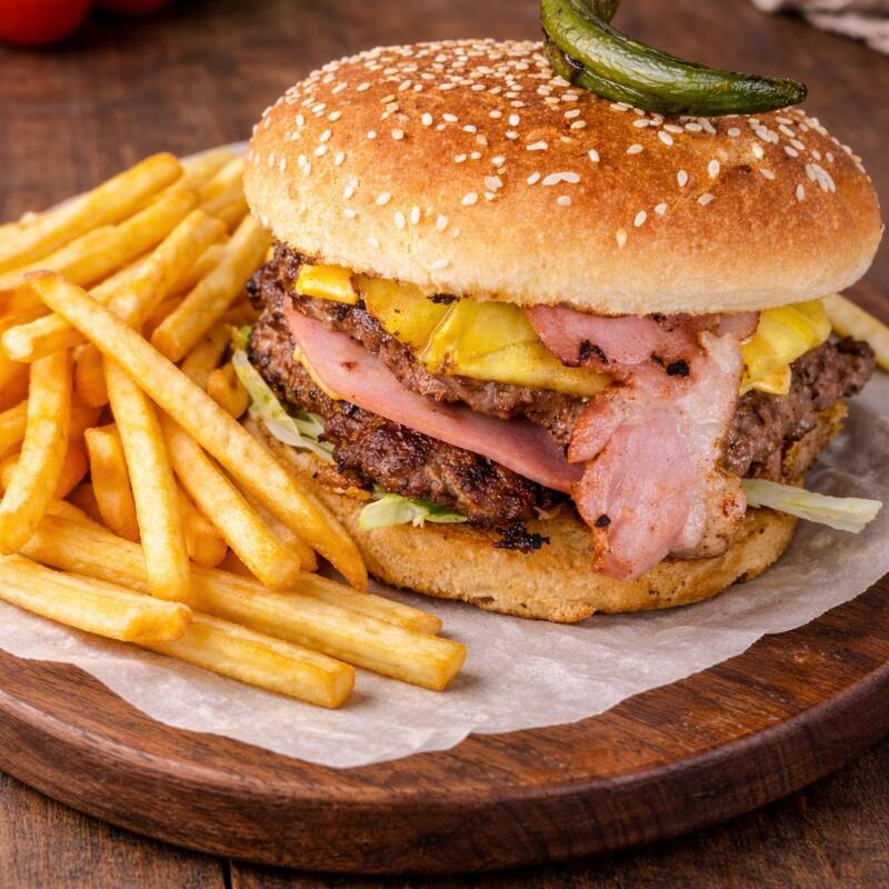 Pan de hamburguesa, mayonesa, carne receta original, queso amarrillo,jamon, piña, tocino lechuga, jitomate, cebolla, porción de papas chile toreado