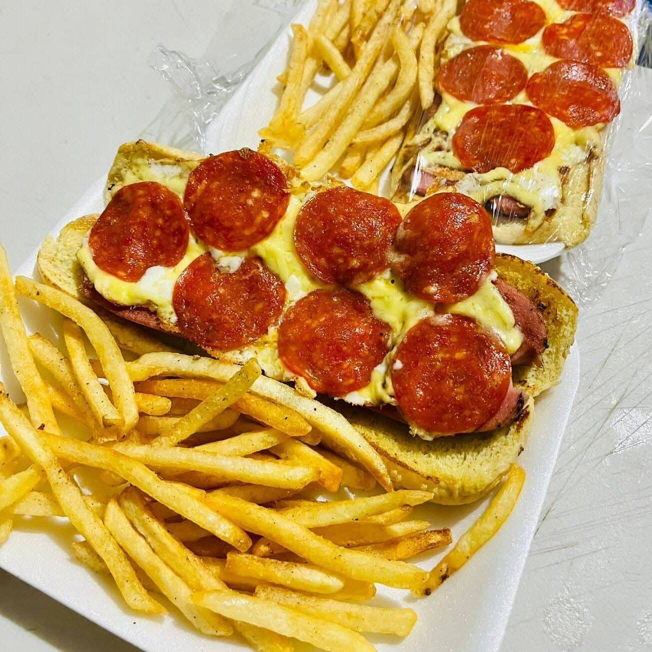 Disfruta de nuestro delicioso Hot Dog jumbo, hecho con pan, salchicha, pepperoni, queso de pizza jitomate, cebolla, chile toreado acompañado con una porción de papas a la francesa.