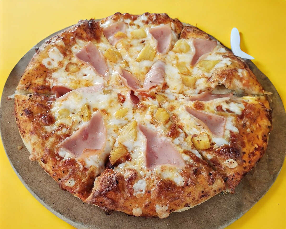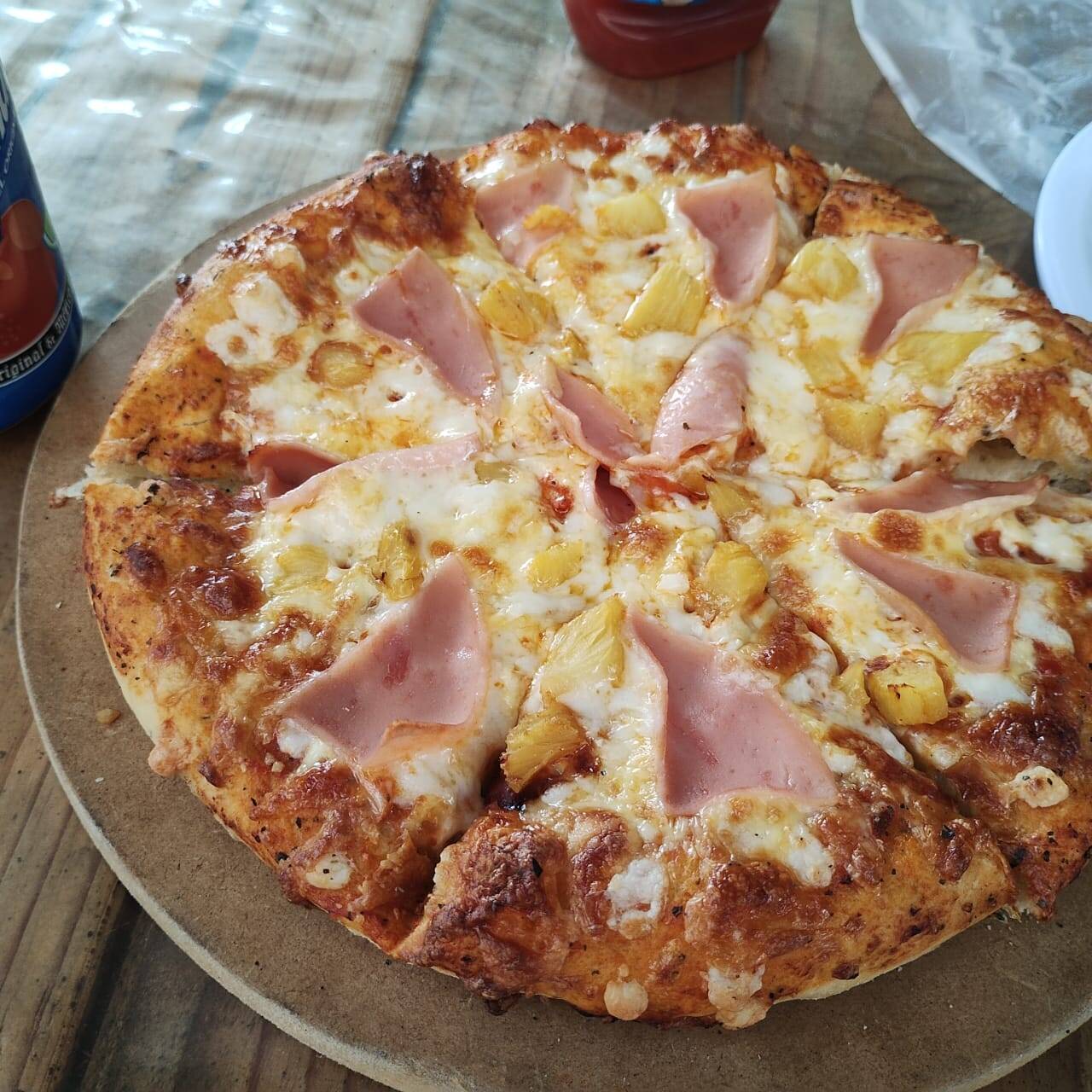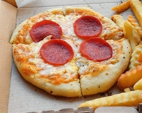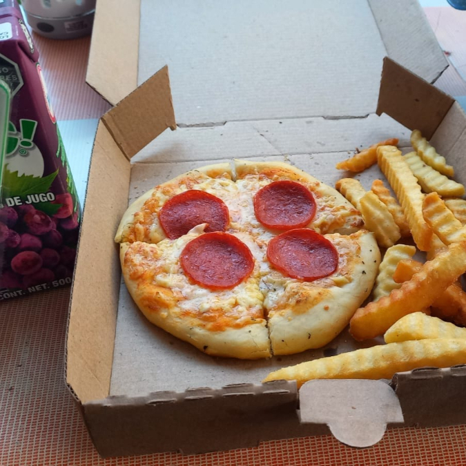 mini pizza a escoger, pepperoni o hawaiana, incluye papas y jugo de 1/4