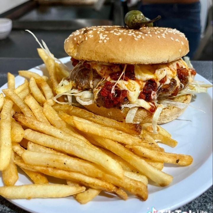 Carne original, queso y chorizo, lechuga, jitomate, cebolla y chile toreado. incluye papas