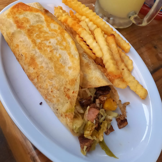 Tortilla de harina, frijoles , bistec ,queso , lechuga y va acompañado con papas