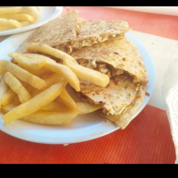 tortilla burrera, queso, bistec,morron,cebolla. Incluye papas