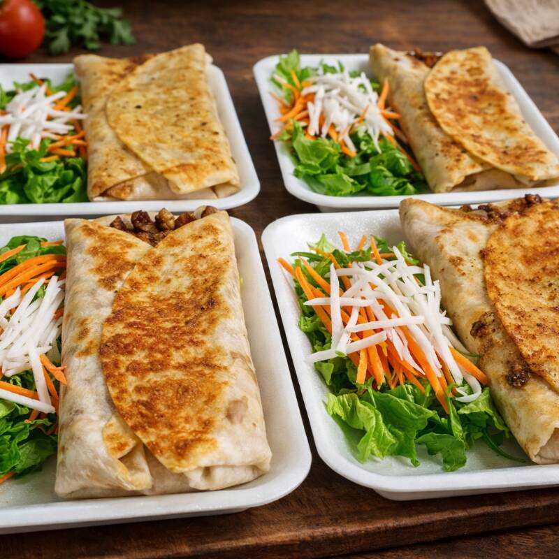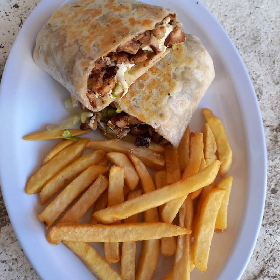 Tortilla burrera, frijoles, bistec, morrón, cebolla, queso, lechuga. incluye papas