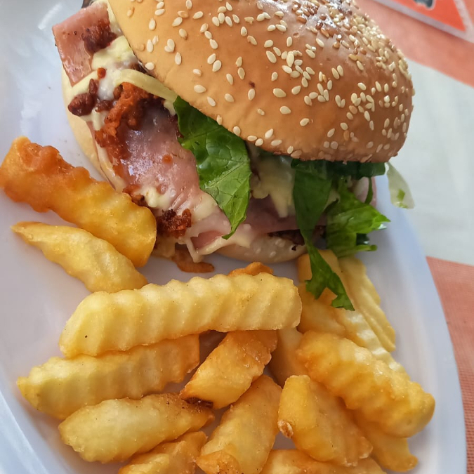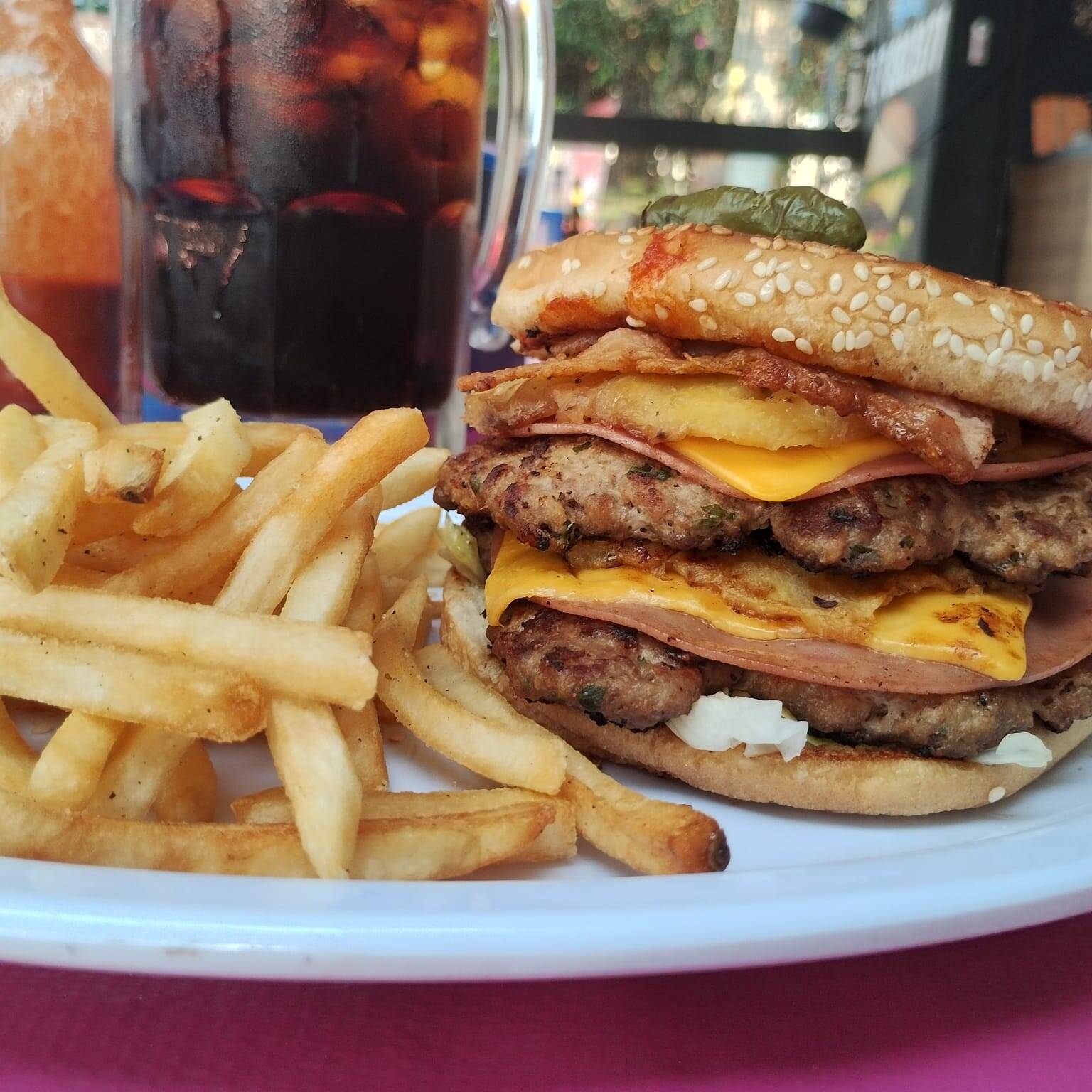 Carne original, queso amarillo, jamón, piña tocino lechuga, jitomate, cebolla y chile toreado. incluye papas