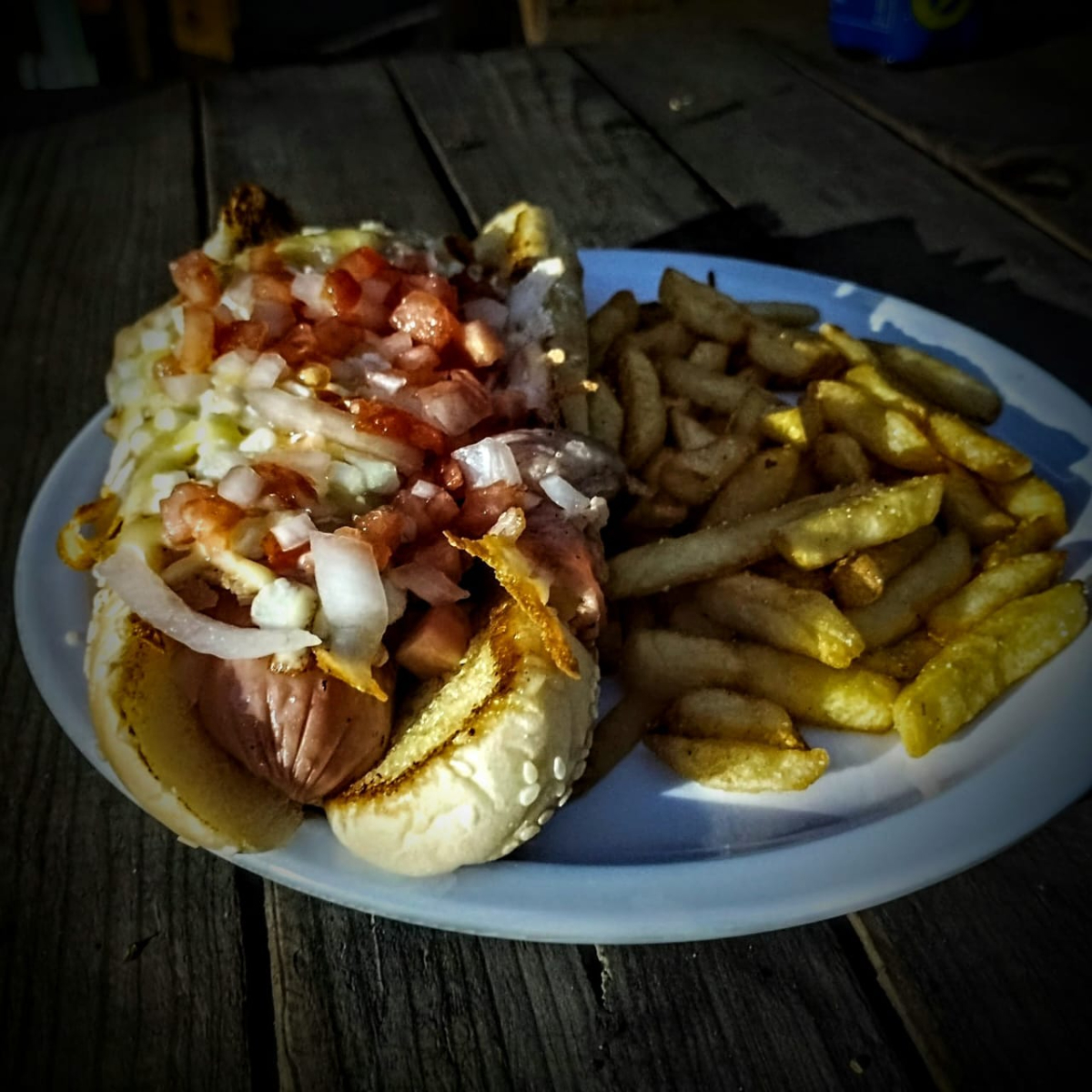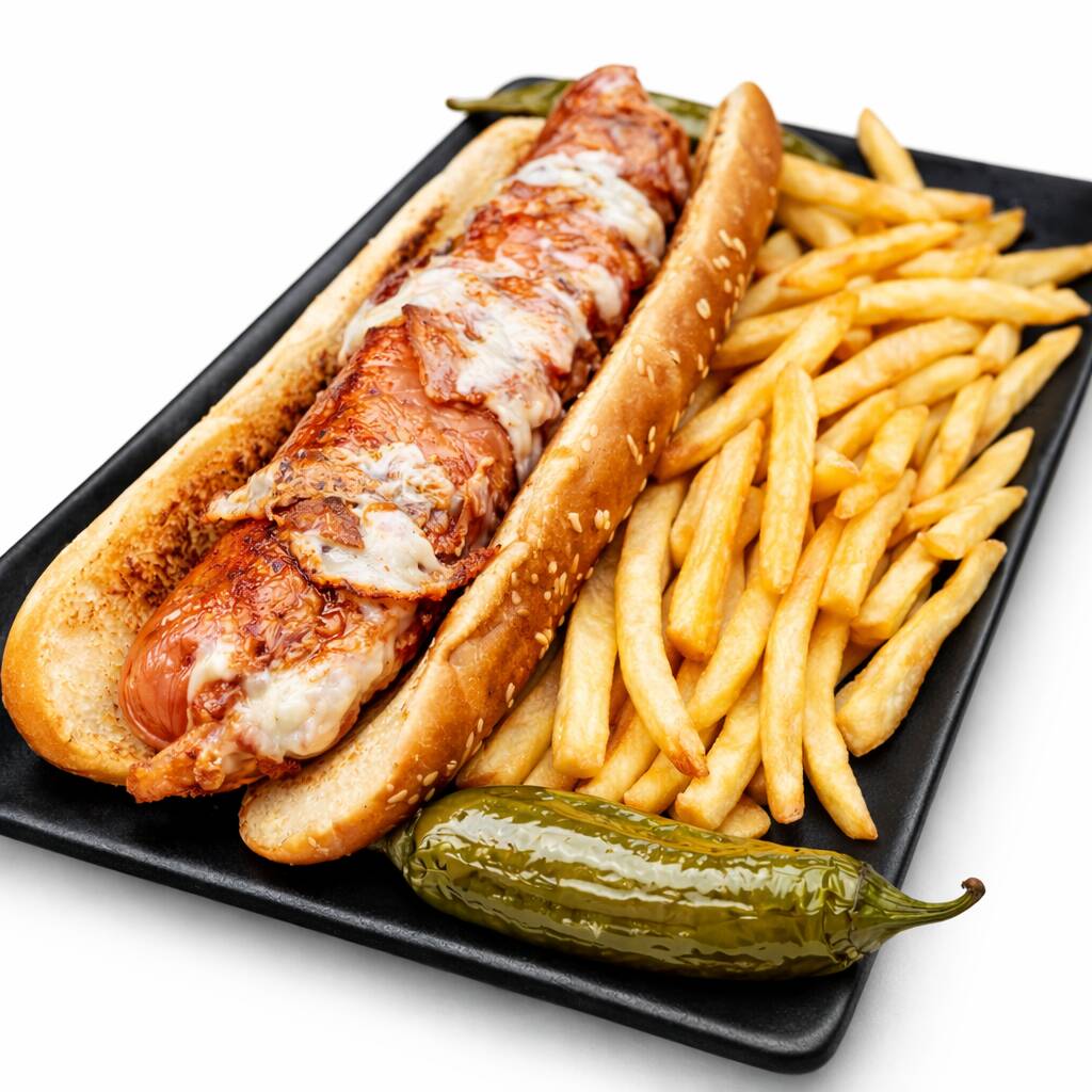 salchicha, arriba lleva queso derretido con pepperoni, chile toreado cebolla y jitomate. incluye papas.