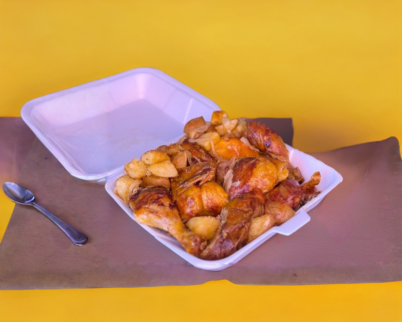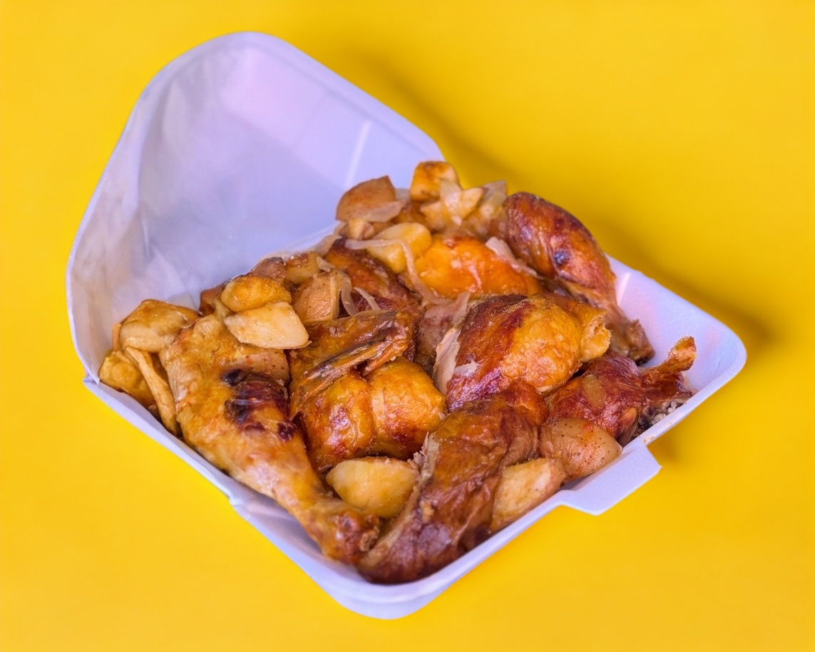 Delicioso pollo acompañado de papas y cebollitas, listo para compartir en familia