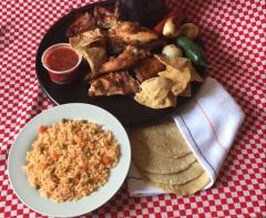1 pollo asado mediano, 1 salsa roja, y 1 paquete de tortillas hechas a mano.