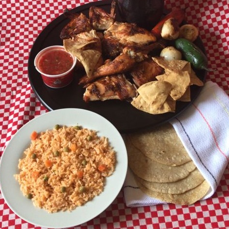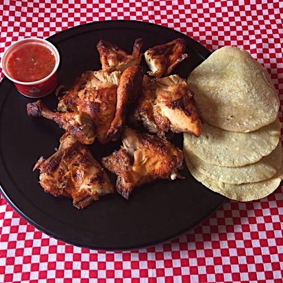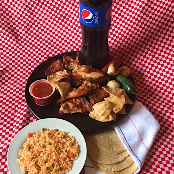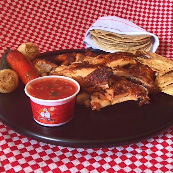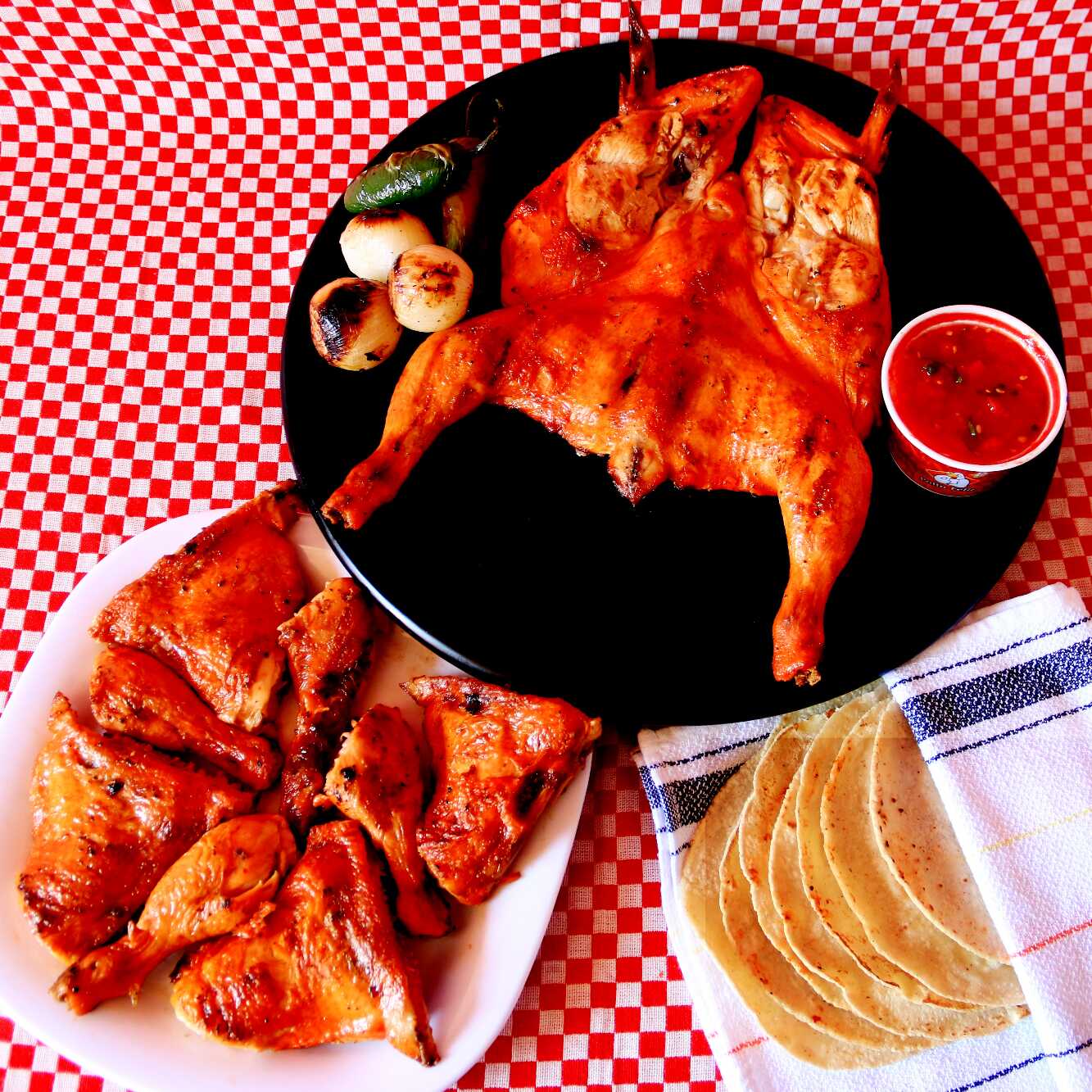 2 pollos asados medianos, 1 complemento, 1 quesadilla, 1 salsa roja, 1 paquete de tortillas hechas a mano y 1 orden de cebollas con chiles.