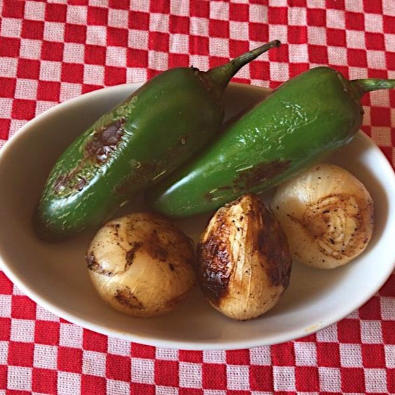 2 pollos asados medianos, 1 complemento, 1 salsa roja, 1 paquete de tortillas hechas a mano y 1 orden de cebollas con chiles asados.