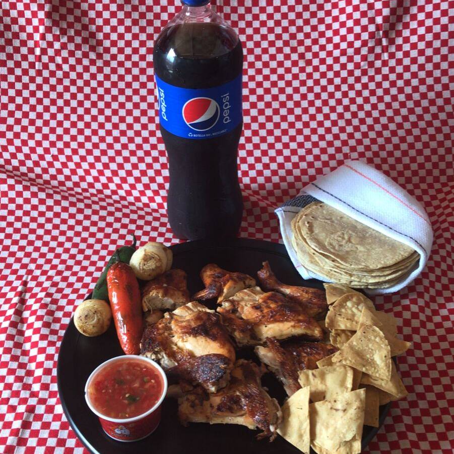 2 pollos asados medianos, 1 refresco de 2 litros, 1 salsa roja, 1 paquete de tortillas hechas a mano y 1 orden de cebollas con chiles asados.