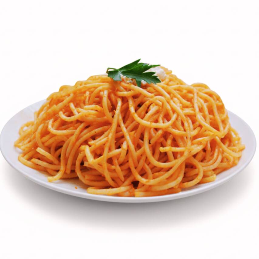 Media porción de espagueti en salsa roja, bien sazonado y perfecto para acompañar tu pollo.