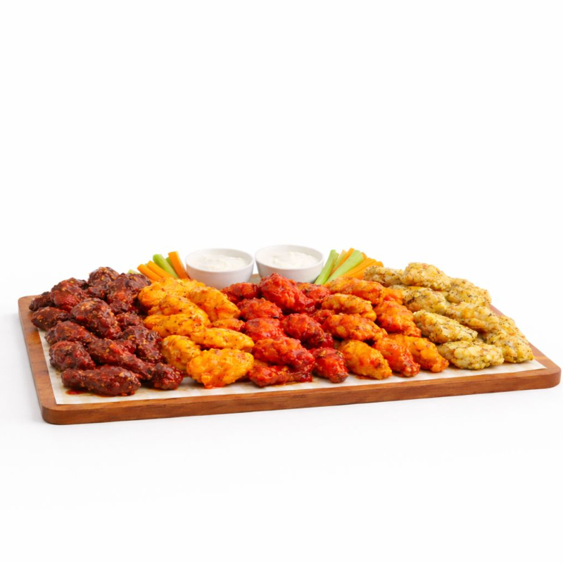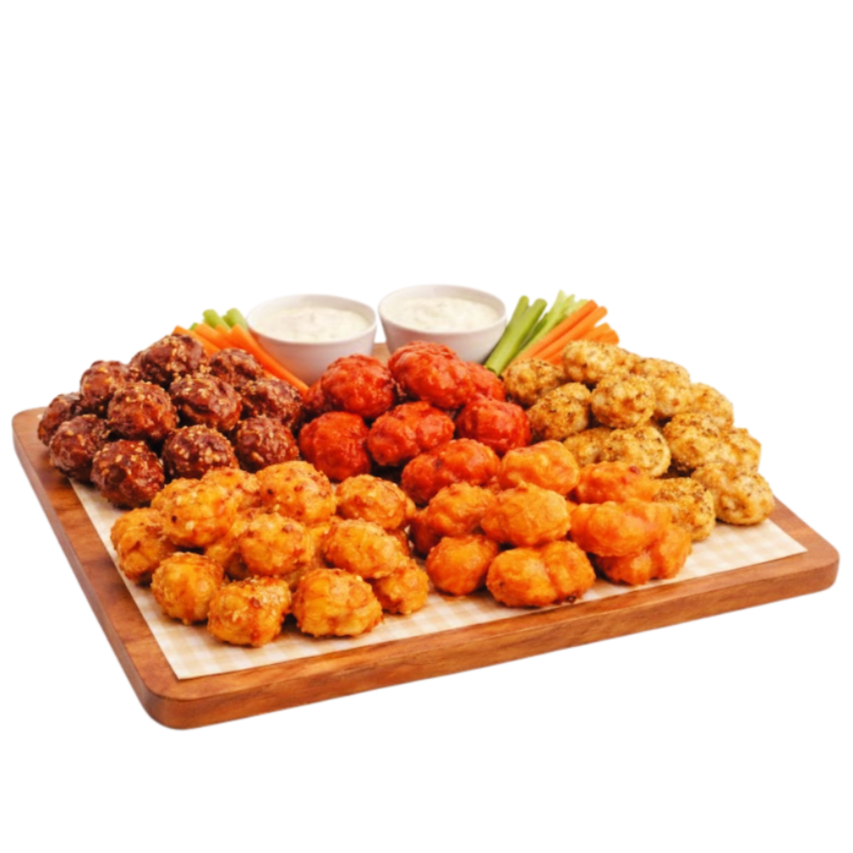 10 piezas de boneless crujientes bañadas en tu salsa favorita. Incluye aderezo ranch y porción de verdura.