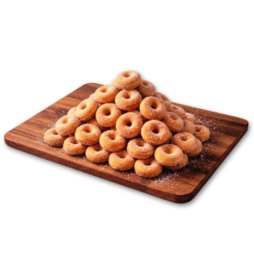 Pequeñas donitas espolvoreadas con azúcar, suaves y listas para disfrutar. Ideales como snack dulce en cualquier momento del día.