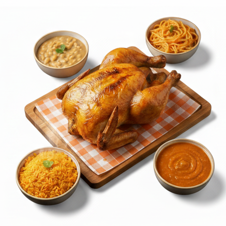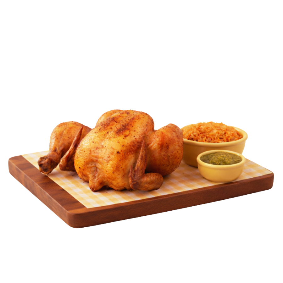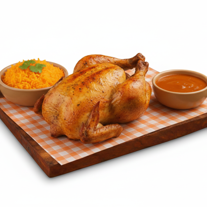 Delicioso pollo rostizado completo, jugoso y doradito. Incluye arroz y salsa para acompañar.
