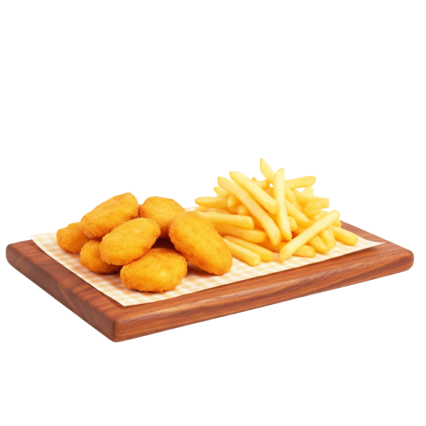 10 piezas de nuggets acompañadas de papas a la francesa doradas y crujientes.