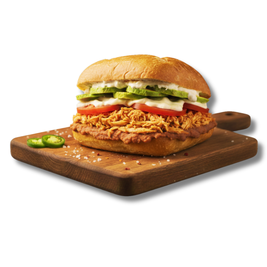 Deliciosa torta preparada con frijoles, mayonesa, pollo jugoso, lechuga fresca, jitomate, cebolla y aguacate.