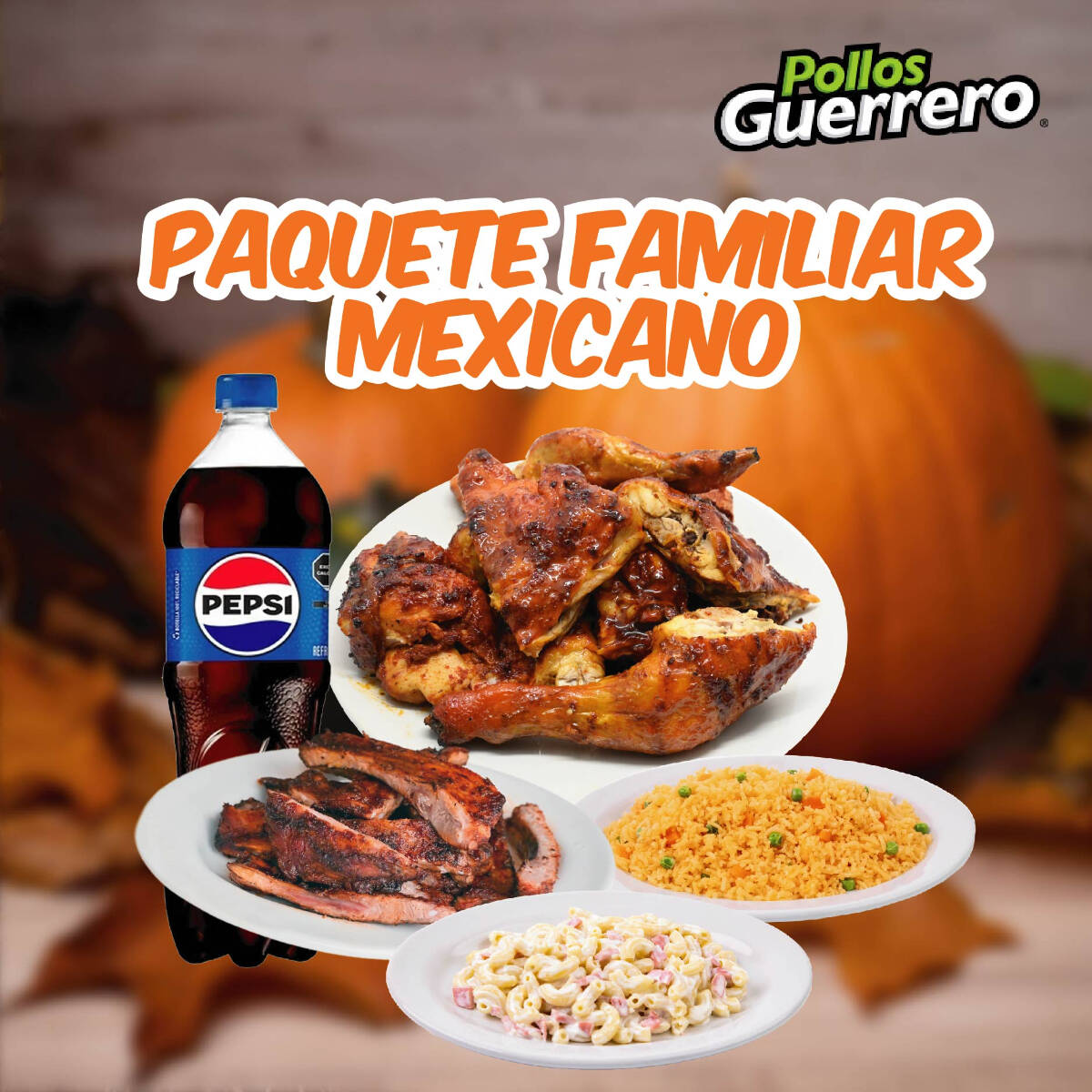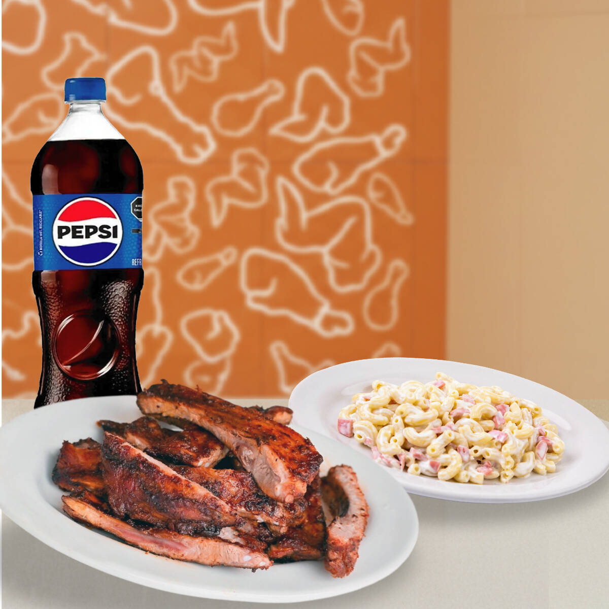 1 pollo Ranchero Adobado bañado en sabor + 1 pieza de costillón, bañado en sabor + 2 Guarniciones a elegir de 350g + 1 refresco familiar