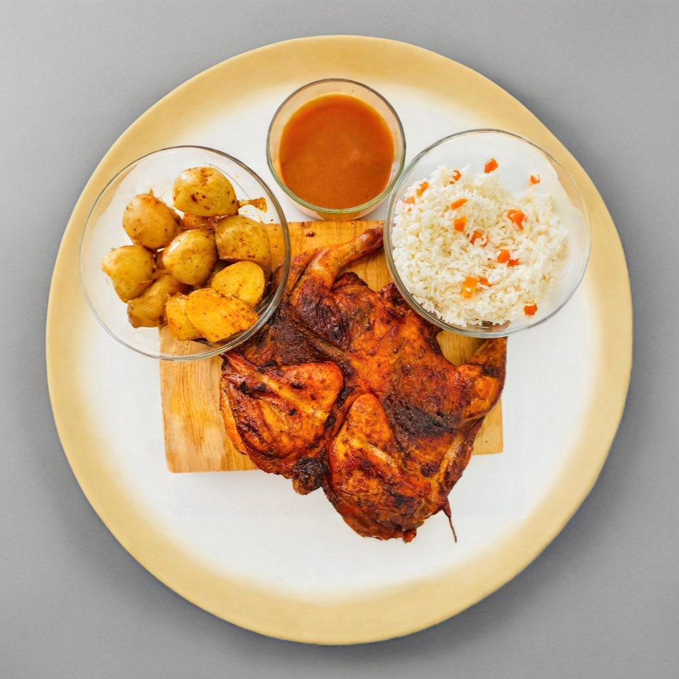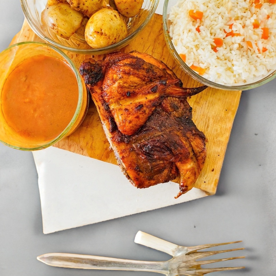 1/2 pollo adobado a la leña, con arroz, papas o cebollas y salsa