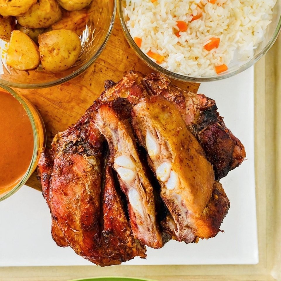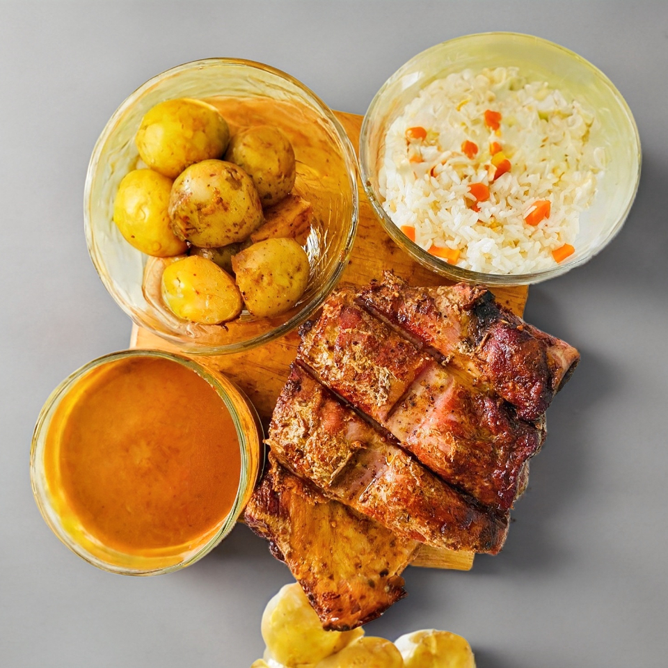 1kg costilla adobada a la leña, con arroz, papas o cebollas y salsa