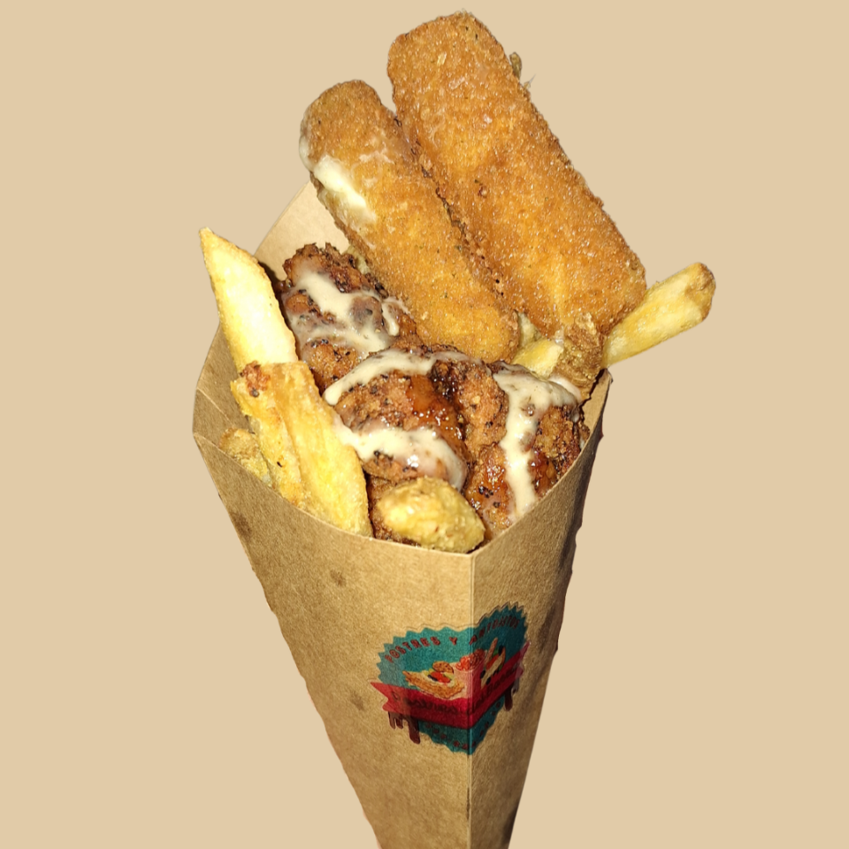 Orden de boneless, papas fritas y dedos de queso. Acompañalo con tus aderezos favoritos.