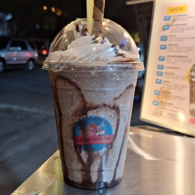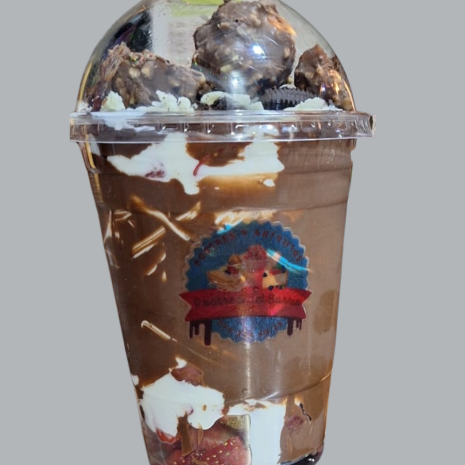 Bebida fría de 16 oz (478 mL) sabor chocolate decorada con chocolate liquido en las paredes del vaso