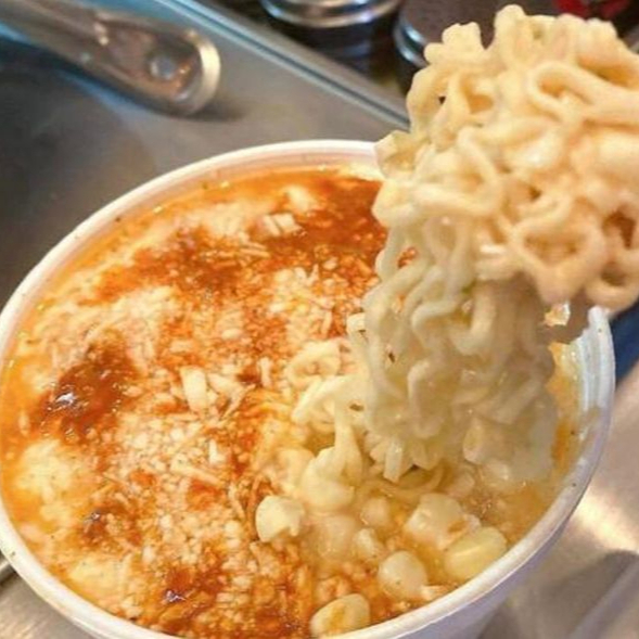 Sopa Maruchan preparada con esquites, mayonesa, queso rayado, queso amarillo y chile.