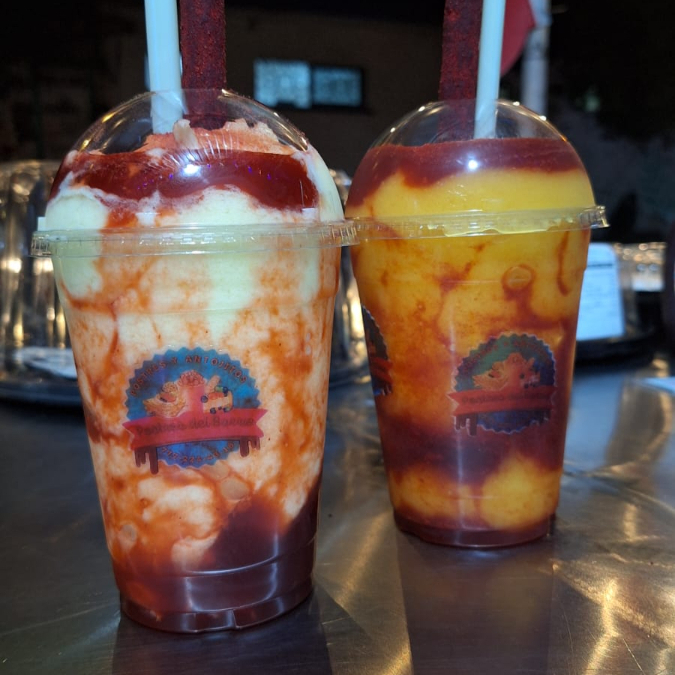 Bebida fría de 16 oz (478 mL) sabor mango con chamoy, decorada con una banderilla de tamarindo picoso