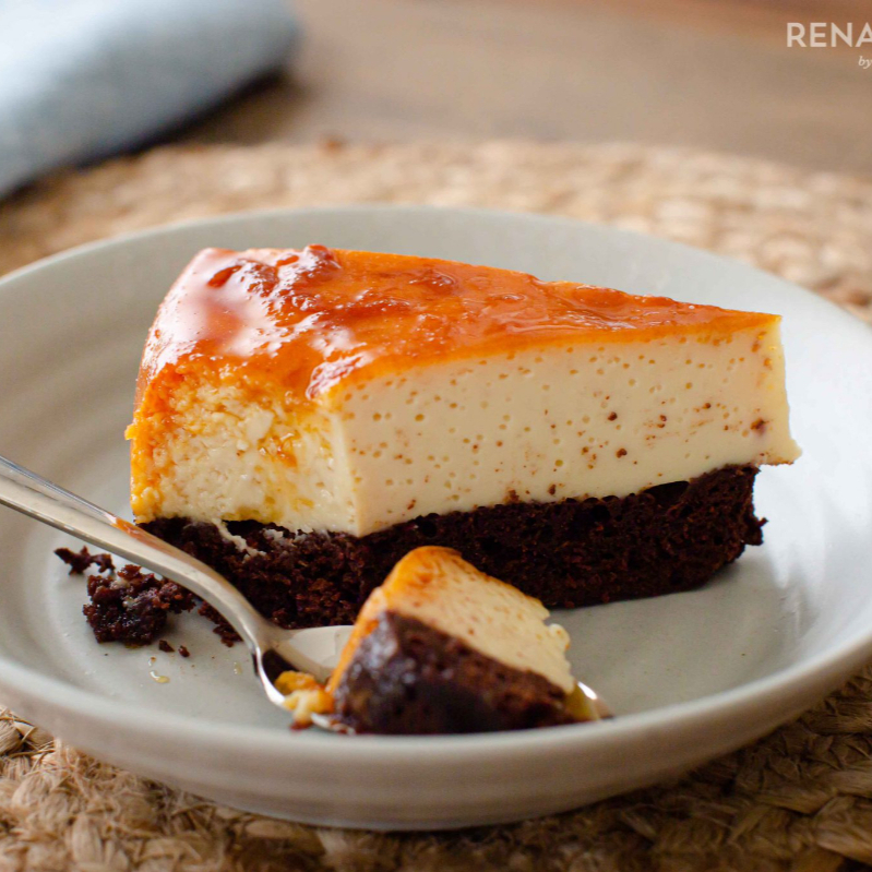 Rica rebanada de pastel, de chocolate con flan napolitano arriba