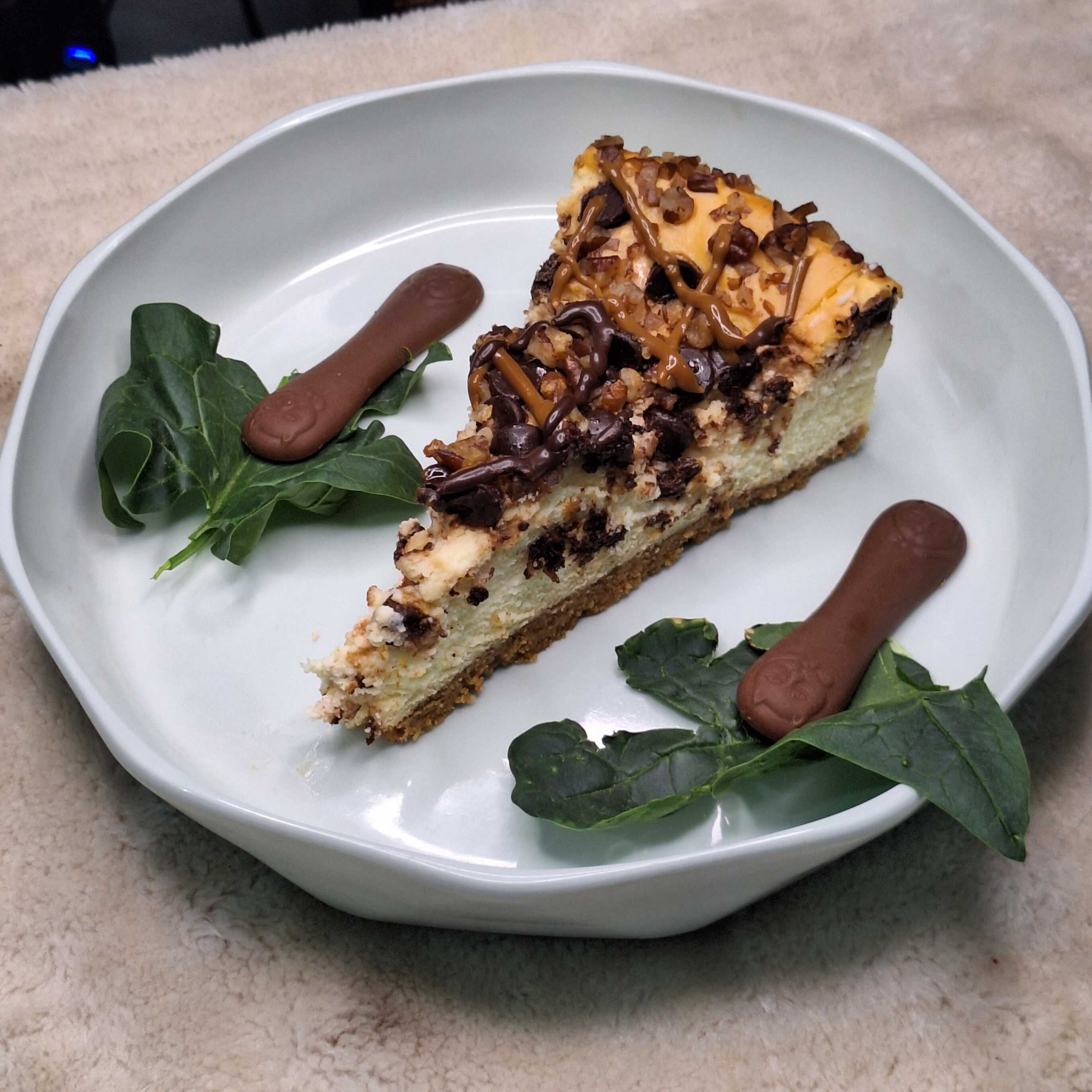 Rico rebanada pastel de queso con cubierta de cajeta, nuez y chispas de rico chocolate