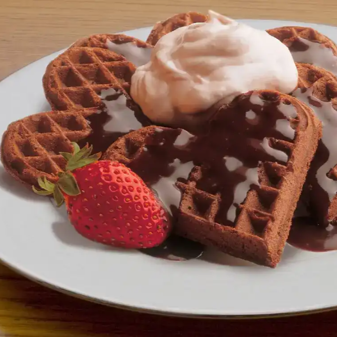 Delicioso waffle con el untable liquido de tu elección y una fruta a elegir.