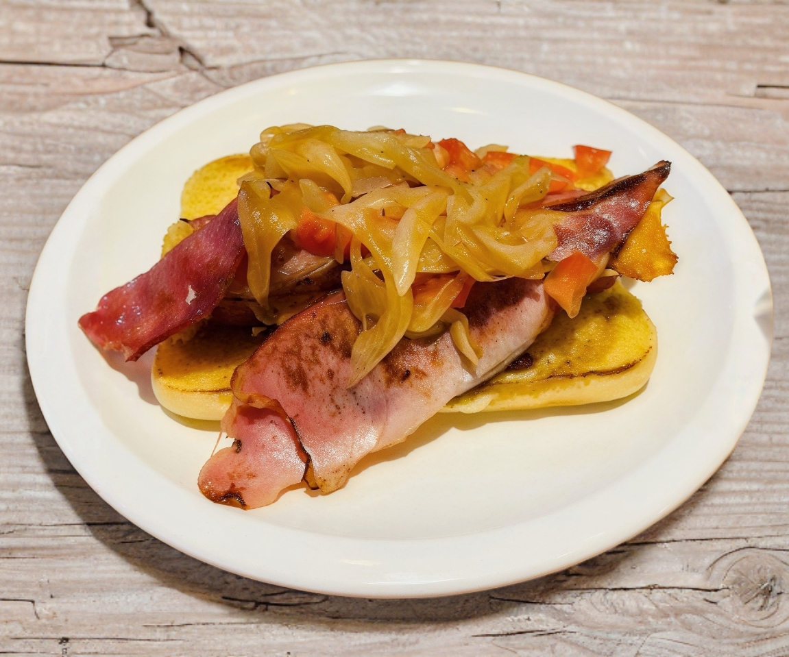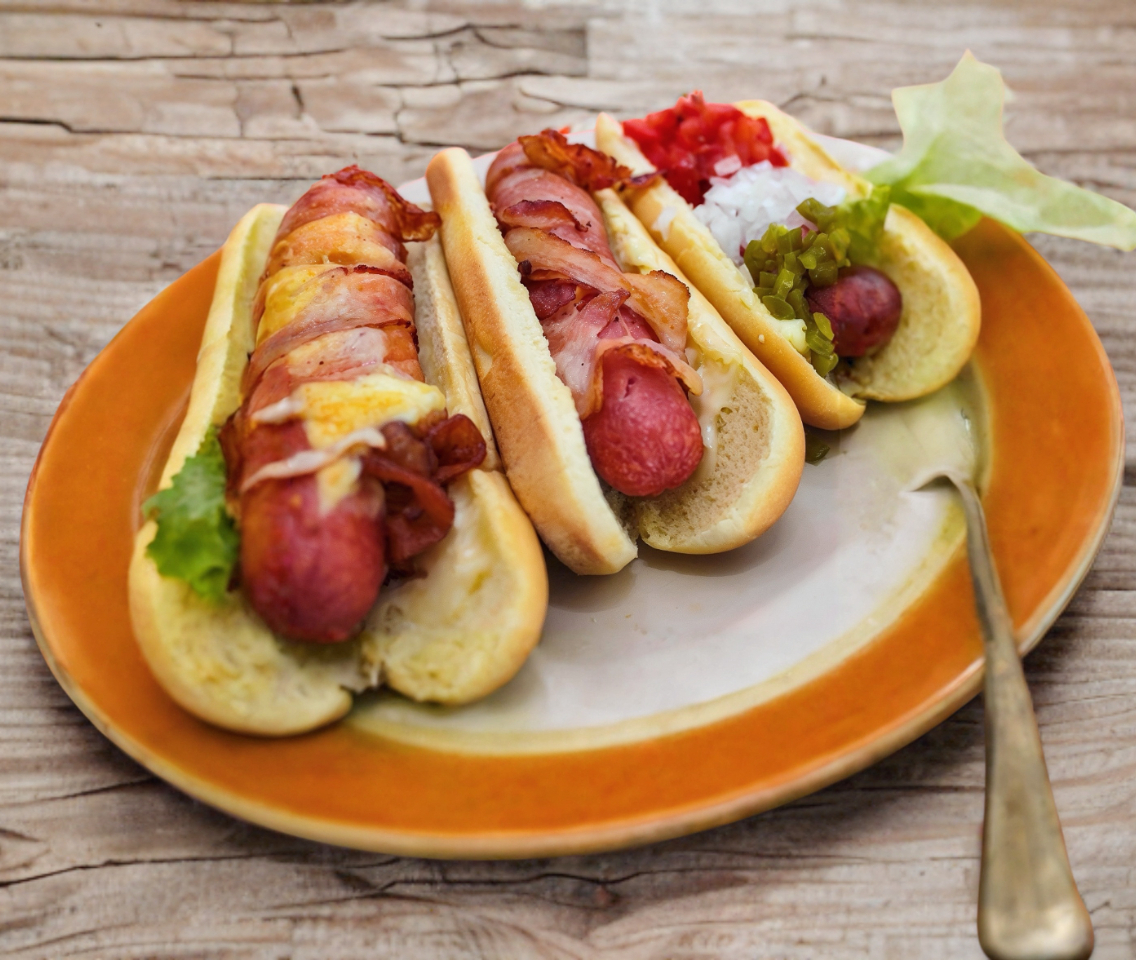 1 hot dog con Salchicha de pavo, tocino y cebolla caramelizada.