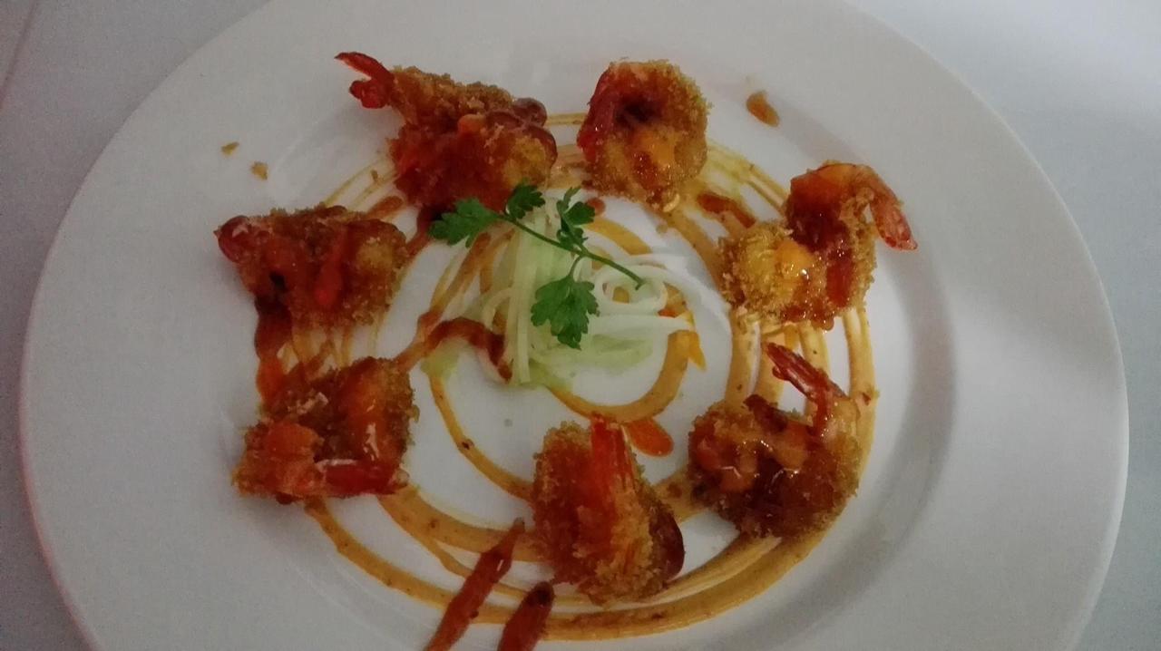 Camarones empanizados bañados en salsa kushiague y salsa pantai., servidos sobre un espejo de salsa chipotle y zanahoria (5pz)